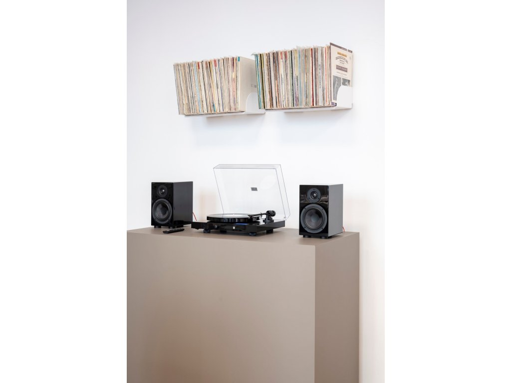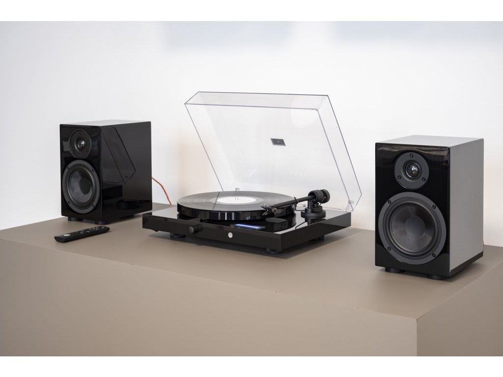 JUKE BOX E1 to gramofon z wbudowanym przedwzmacniaczem gramofonowym, odbiornikiem Bluetooth i zintegrowanym wzmacniaczem w jednej obudowie, wymagający jedynie podłączenia pary głośników do stworzenia kompletnego systemu muzycznego. Jeśli myślałeś, że system startowy musi być skomplikowany, JUKE BOX E1 udowadnia, że jest inaczej. Jest fabrycznie w pełni skonfigurowany, a po podłączeniu głośników możesz od razu zacząć słuchać muzyki. Dostarczany jest z wykończeniem na wysoki połysk w kolorach czarnym, białym i czerwonym. W zestawie znajduje się również osłona przeciwpyłowa.