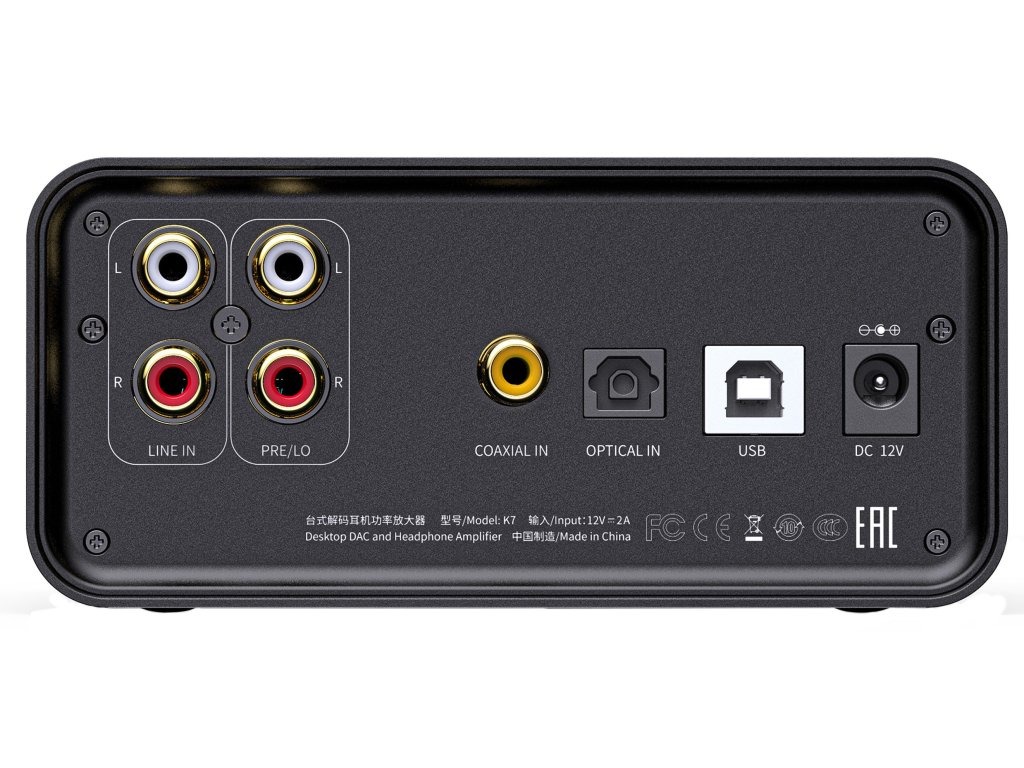 Jak to zwykle bywa w FiiO, K7 ma aluminiową obudowę z dodatkami z innych materiałów. Z przodu znajdują się przełączniki wejścia, wzmocnienia i wyjścia. Ponadto znajduje się tu podświetlane pokrętło do włączania i regulacji głośności oraz dwa wyjścia słuchawkowe – niesymetryczne 6,35 mm i symetryczne 4,4 mm. Z tyłu znajduje się wejście RCA line-in, wyjście RCA line-out, wejście koaksjalne, optyczne i USB oraz wejście zasilania.