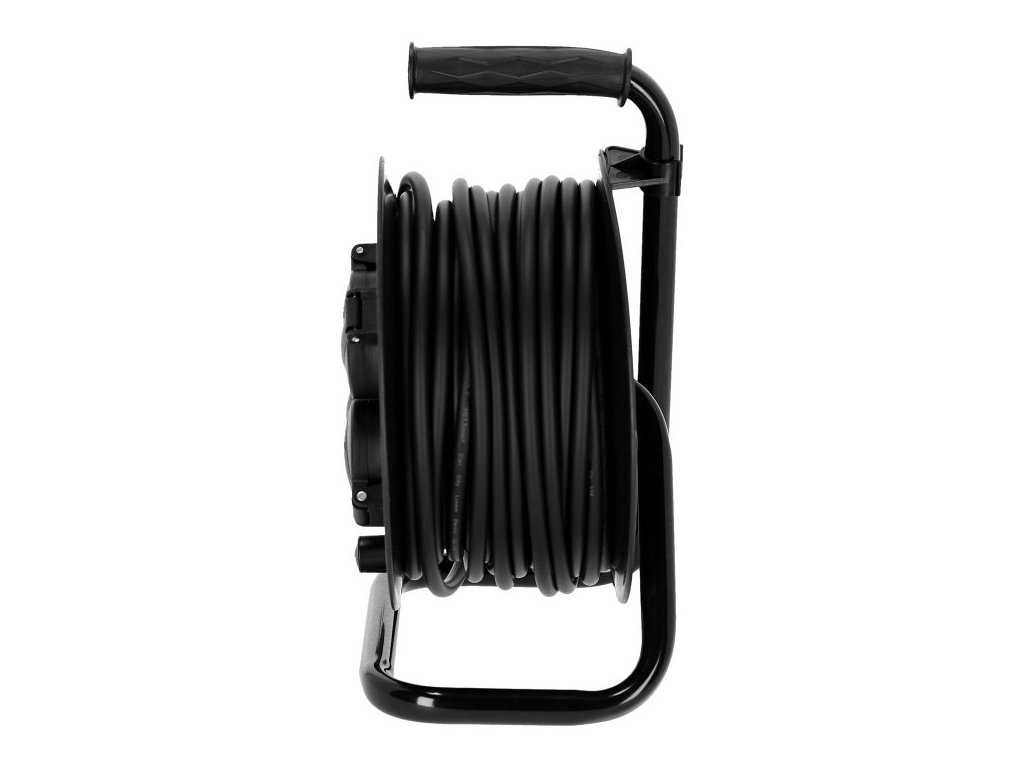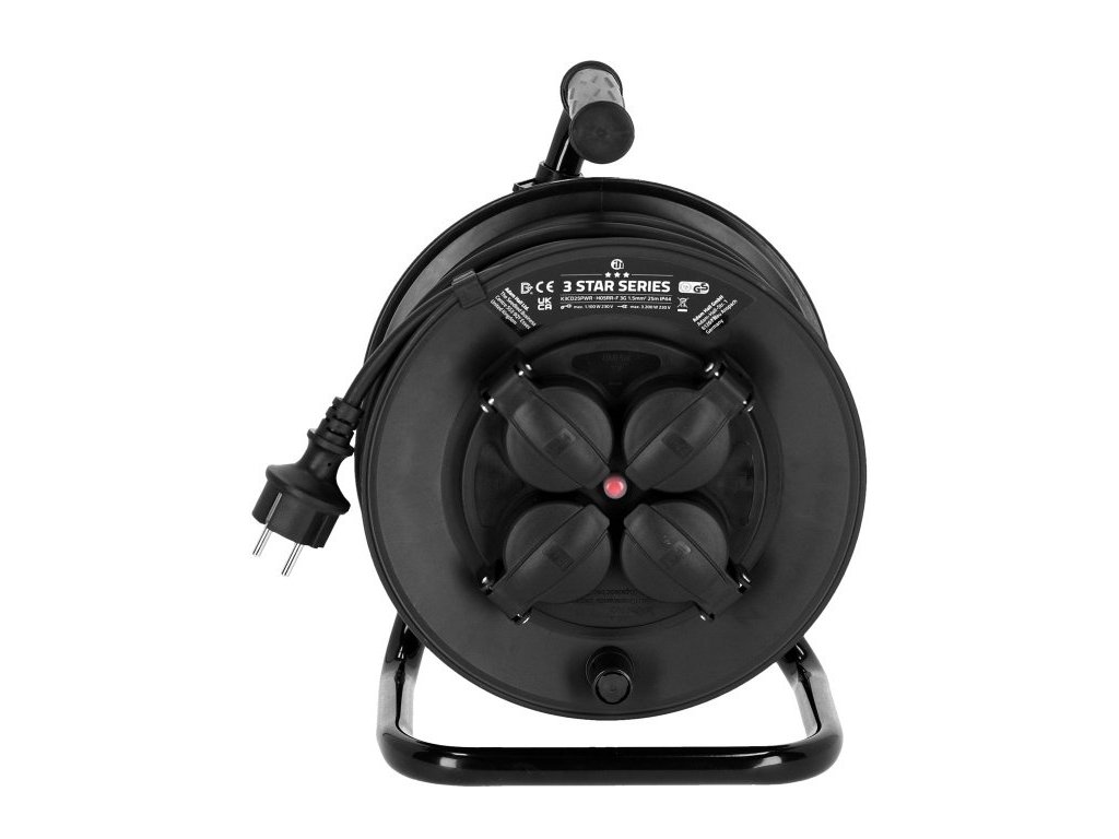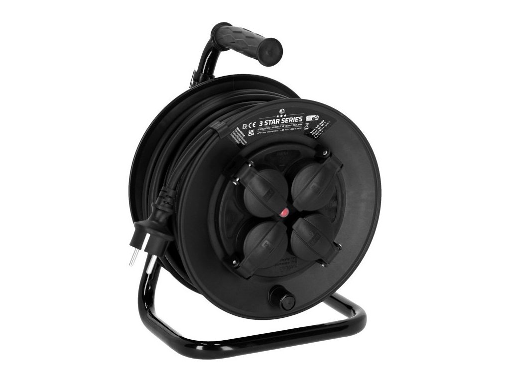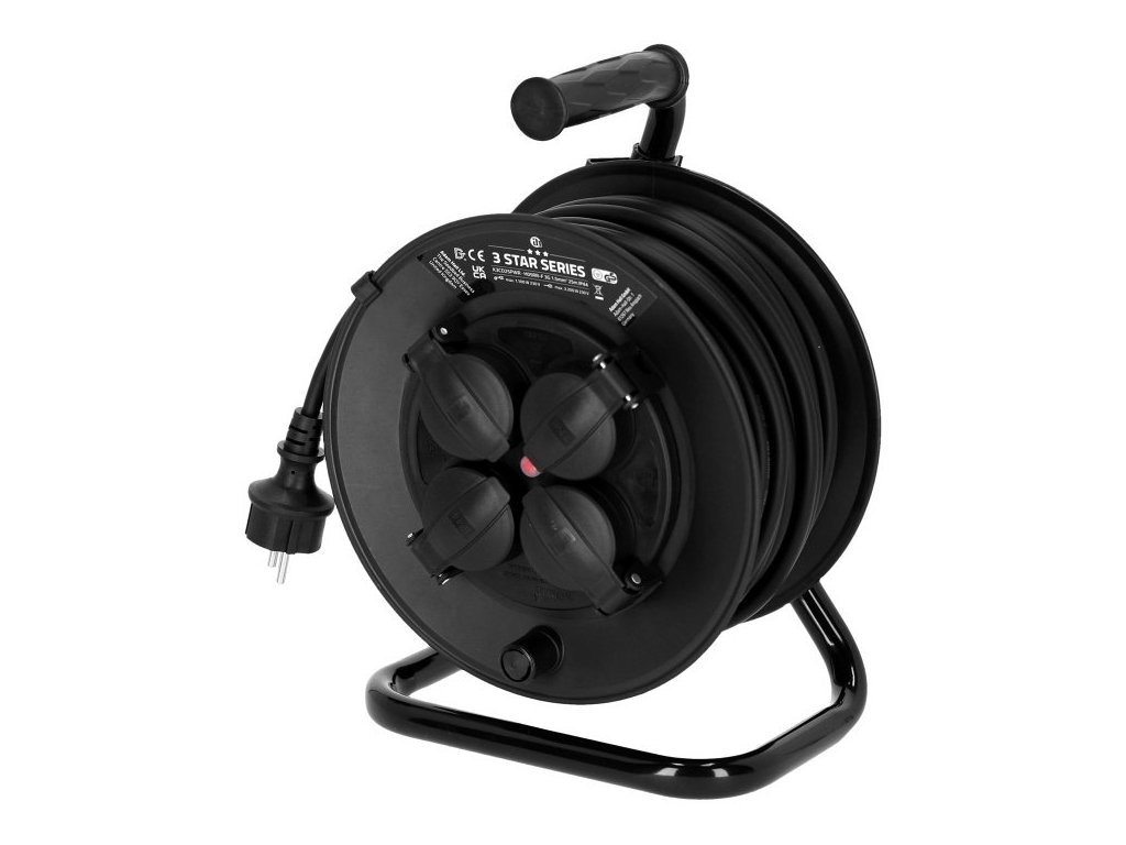 Te bębny kablowe zasilające są wykonane z profesjonalnego kabla zasilającego i płaszcza z gumy (H05RR-F), a także z wewnętrznym przekrojem przewodu 3 x 1,5 mm². Cztery gniazda z klasą ochrony IP44 są chronione przed bryzgającą wodą i ciałami obcymi, takimi jak np. piasek. Zintegrowane zabezpieczenie przed przegrzaniem gwarantuje szybkie wyłączenie. Ten produkt jest dostępny w długościach 25 m i 50 m.