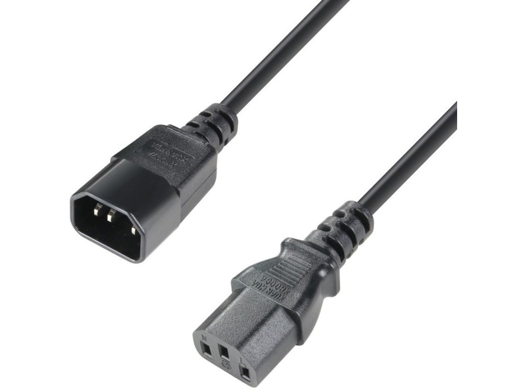 Przedłużacz zasilający IEC C13 (F) - C14 (M), idealny do przedłużania kabli IEC lub do podłączania urządzeń ze złączami IEC. Długość 0,5 m. Kolor czarny.