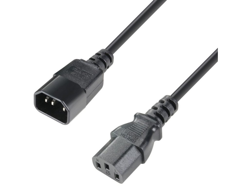 Przedłużacz zasilający IEC C13 (F) - C14 (M), idealny do przedłużania kabli IEC lub do podłączania urządzeń ze złączami IEC. Długość 1 m. Kolor czarny.