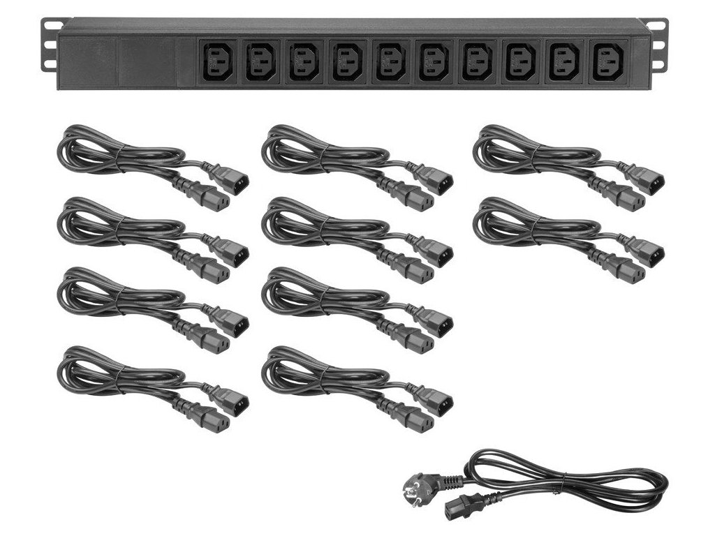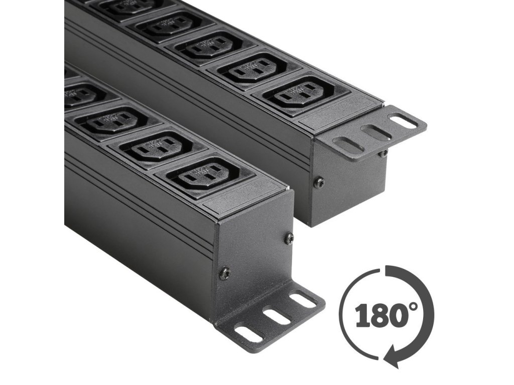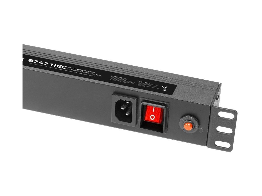Ta listwa zasilająca do montażu w szafie rack o rozmiarze 1 U zapewnia dziesięć uziemionych gniazd IEC C13 z tyłu aluminiowej obudowy 19". Panel przedni jest wyposażony w gniazdo C14, podświetlany wyłącznik główny i resetowalny wyłącznik automatyczny do ochrony przed przeciążeniem.