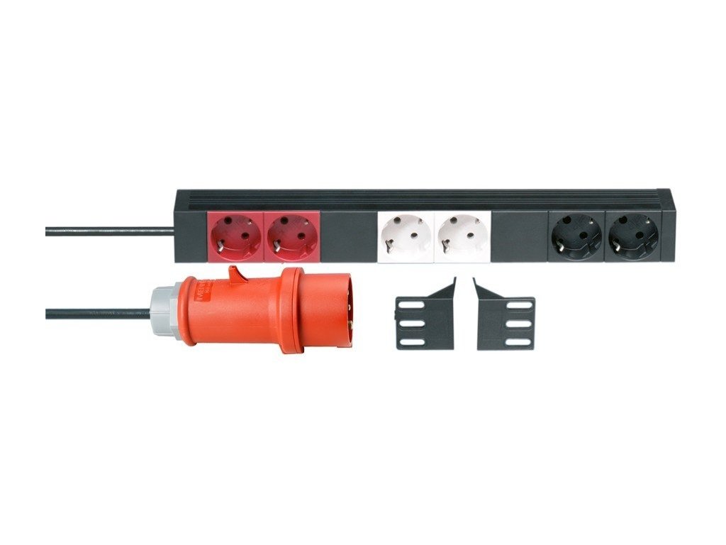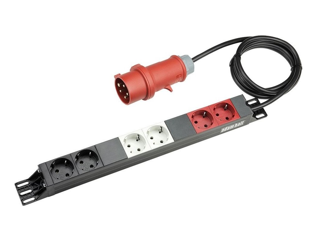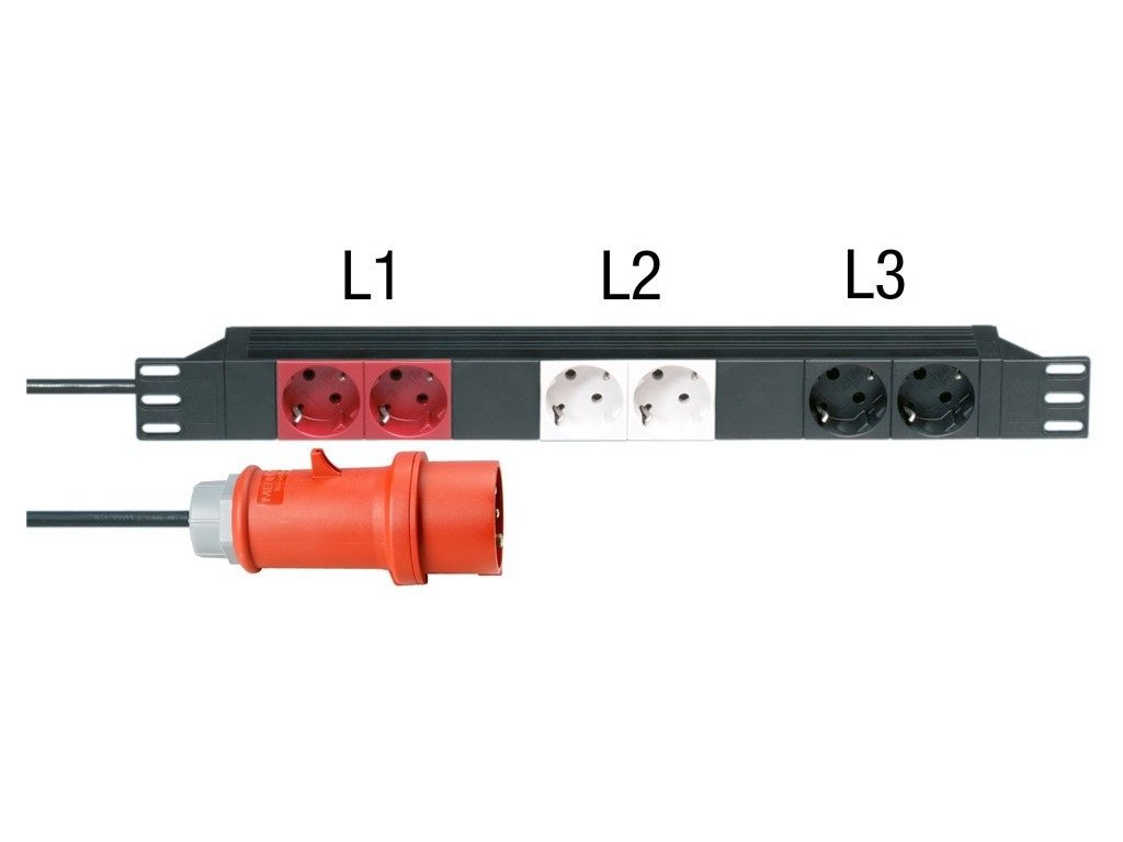 Listwa zasilająca 19" 1 U z 3 oddzielnymi obwodami zasilania, gniazda bezpieczeństwa, każde o prądzie 16 A / 250 V. Gniazda pierwszego obwodu zasilania są rubinowo czerwone, obwód zasilania drugi jest jasno szary, a trzeci czarny. Kabel 2m z czerwoną wtyczką CEE, 16 A na fazę / 400 V, uchwyty 19" można montować w różnych pozycjach.