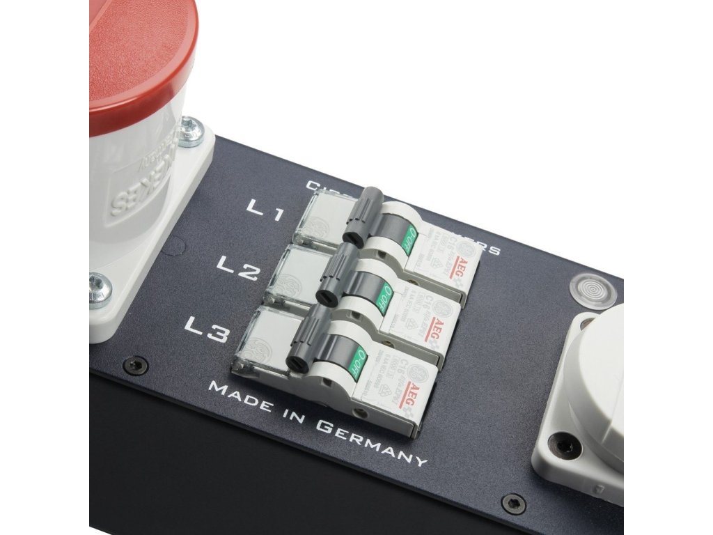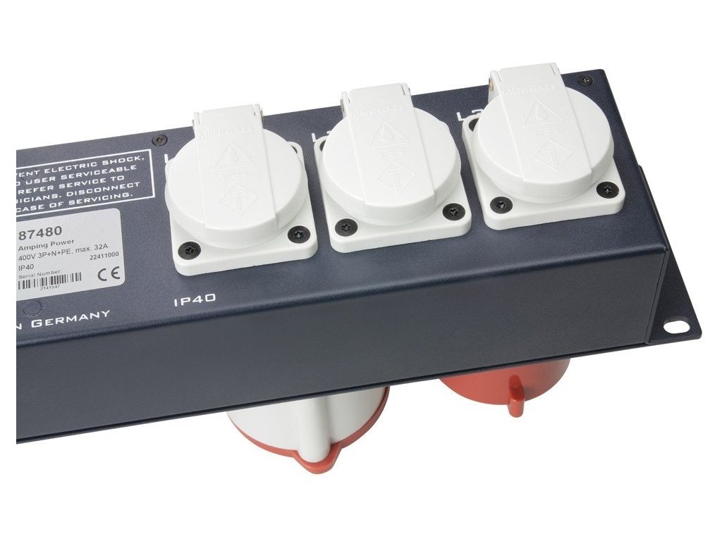 Te rozdzielnice energii to ekonomiczne źródła energii. Są przeznaczone do codziennego użytku na scenie i zapewniają podstawowe dostawy zwykłej energii elektrycznej. Komponenty zostały wybrane na podstawie spełnienia odpowiednich wymogów bezpieczeństwa i korzystnego stosunku ceny do wydajności. 3 x lampki kontrolne do sterowania fazami L1, L2, L3. Wejście przez gniazda CEE 32 A do montażu na panelu 5-biegunowych gniazd czerwonych. Wyjście równolegle do wejścia gniazdo CEE 32 A 5-biegunowe czerwone. Zabezpieczenie za pomocą 3 x wyłączników C16. Wyjście z przodu przez 3 x gniazda panelowe z odchylanymi pokrywkami w kolorze szarym. Tylny wyjście przez 6 x gniazda panelowe z odchylanymi pokrywkami w kolorze szarym.