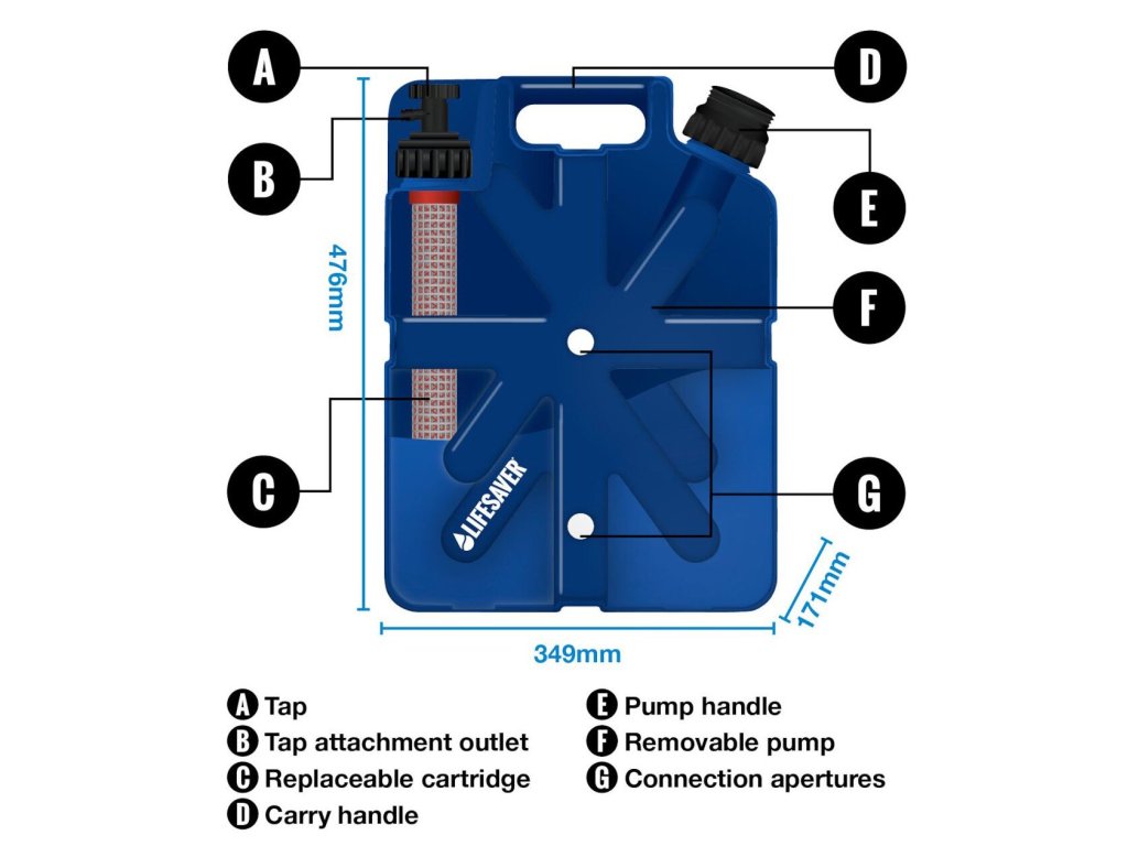 Wytrzymały, przenośny filtr i oczyszczacz wody zdolny do filtrowania 20 000 litrów wody, z której natychmiast usuwa wirusy, mikroorganizmy i bakterie. Kanister mieści do 18,5 litra jednorazowo. Idealny dla większej grupy osób przebywających poza cywilizacją, np. na ekspedycjach. Kompatybilny ze standardowymi stojakami na kanistry w samochodach. Również doskonałe źródło wody pitnej dla całego gospodarstwa domowego w razie nagłej potrzeby.