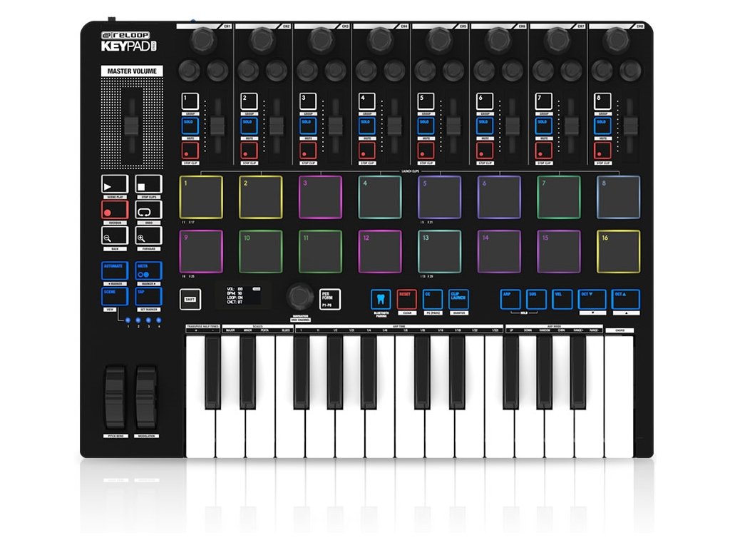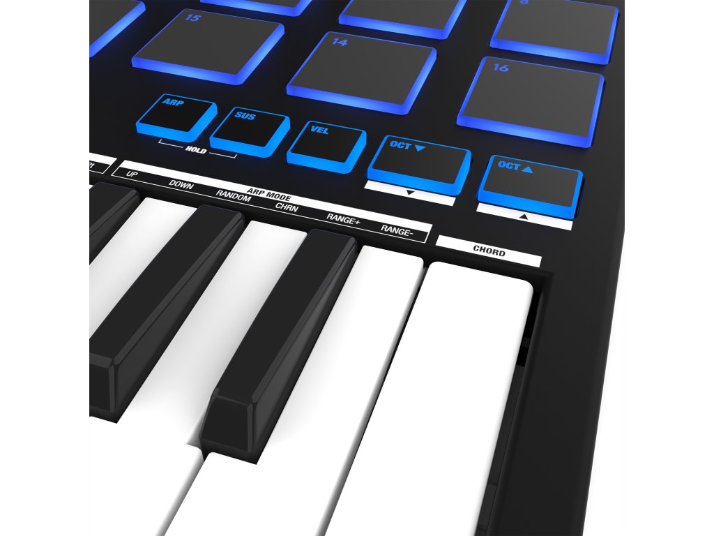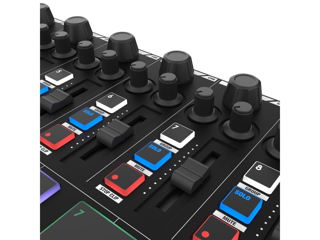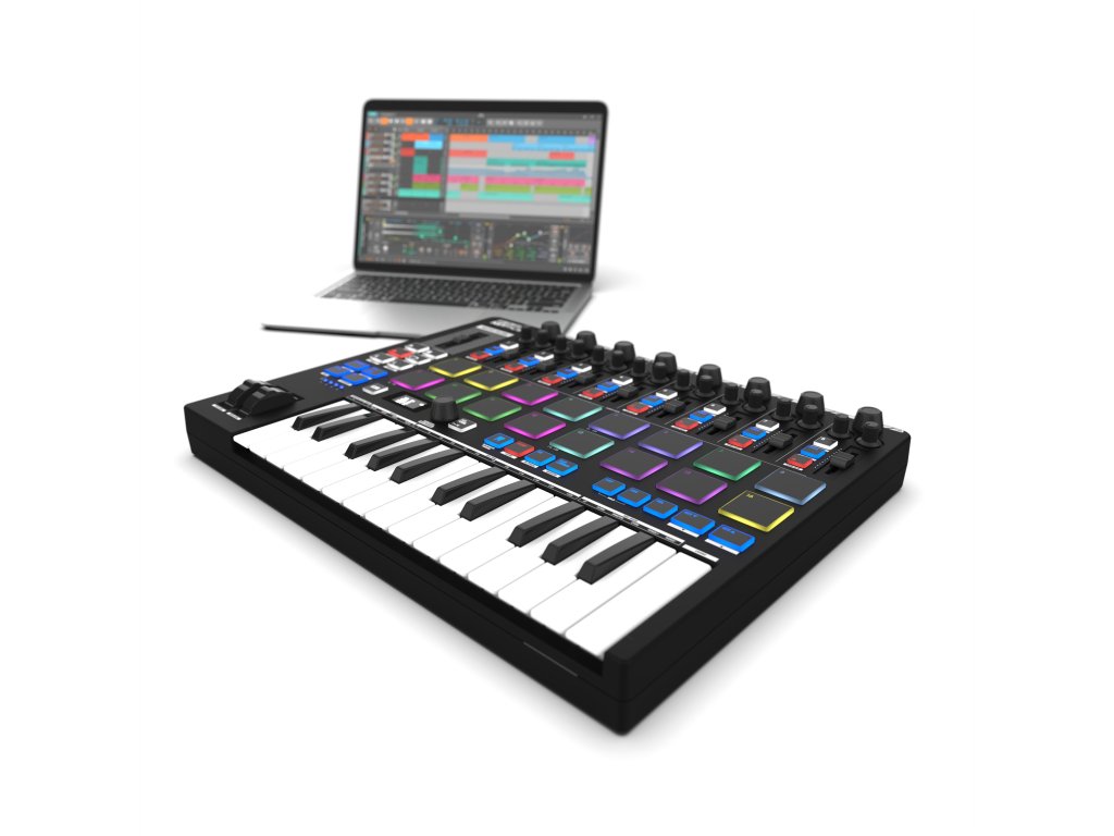 Dostępny jest również arpeggiator z szeroką gamą patternów, funkcja uproszczonego grania akordów i inteligentny tryb skal. 16 czułych na nacisk, podświetlanych diodami RGB padów perkusyjnych z funkcją aftertouch zapewnia maksymalną elastyczność podczas tworzenia beatów i uruchamiania klipów. Osiem pełnowartościowych channel stripów z faderem, enkoderem (panorama), potencjometrami (send/return) i przyciskami funkcyjnymi oferuje precyzyjną kontrolę miksowania. Główna sekcja do obsługi DAW zawiera przyciski transportu, nagrywania i inne kluczowe funkcje. Wyświetlacz OLED ułatwia monitorowanie parametrów.