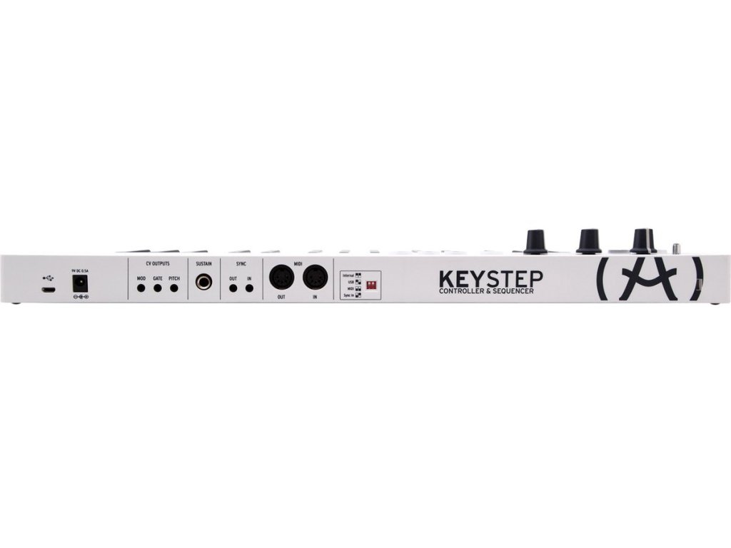 To, co czyni Keystep wyjątkowym kontrolerem, to jego rozszerzona łączność. Oprócz standardowego USB znajdziesz również wejście i wyjście dla MIDI, gniazda do synchronizacji zegara, gniazda DIN sync, wyjścia CV/Gate i oddzielne wyjście CV, któremu można przypisać kontroler Mod, dynamikę klawiatury lub aftertouch. W praktyce oznacza to, że za pomocą Keystepu możesz sterować nie tylko oprogramowaniem, ale także całą kolekcją analogowych syntezatorów i modułów, synchronizować urządzenia MIDI etc. Port USB podczas podłączenia do komputera ładuje kontroler, jeśli chcesz go używać oddzielnie, możesz podłączyć zasilacz.