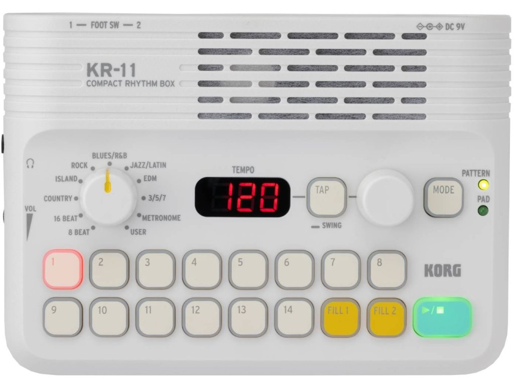 Po prostu wybierz swój ulubiony gatunek i zacznij! Każdy gatunek zawiera 14 pojedynczych wariacji, co daje łącznie 126 różnych rytmicznych patternów. Ponadto dostępnych jest 14 miejsc w pamięci na własne rytmy, co pozwala dostosować KR-11 do własnych potrzeb. KR-11 można zasilać bateriami, a także jest lekki i kompaktowy. Wbudowany głośnik pozwala natychmiast grać razem z ogromnym wyborem fraz rytmicznych. Oprócz podstawowych patternów, takich jak 8-beat i 16-beat, KR-11 oferuje również bardziej specyficzne style, takie jak "Blues/R&B" i "Country" dla gitarzystów, ale także "Island", rytm specjalnie zaprogramowany dla graczy na ukulele. Oprócz zwykłych rytmów 3/4, KR-11 zawiera również mniej popularne rytmy, takie jak 5/4 i 7/8. Funkcja "Swing" może być użyta do dodania potrzebnego ludzkiego czynnika do groove'ów. KR-11 oczywiście zawiera również funkcję metronomu do ćwiczeń, dzięki czemu jest praktycznym towarzyszem dla szerokiego spektrum muzyków, takich jak gitarzyści, basiści, klawiszowcy i gracze orkiestrowi.