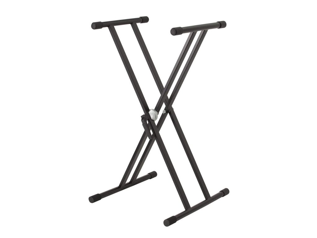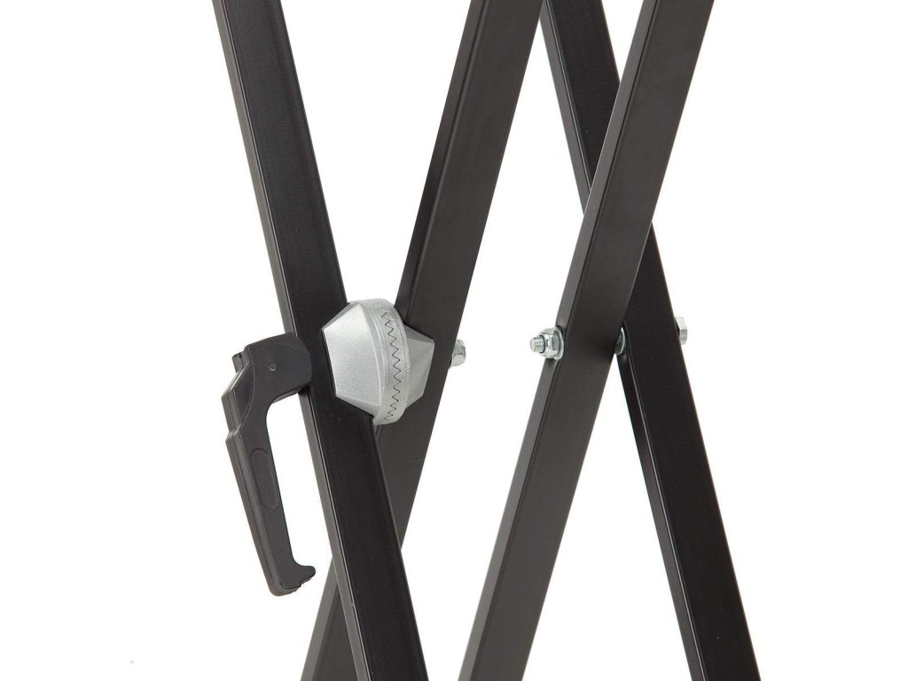 Niezawodny statyw z podwójnym wspornikiem wykonany jest ze stali z prostym systemem regulacji wysokości. Całkowitą stabilność i ochronę przed zarysowaniem instrumentu zapewniają gumowane końcówki konstrukcji. Przy maksymalnym obciążeniu 70 kg pasuje do szerokiej gamy instrumentów, od keyboardów, workstationów po pianina cyfrowe.
