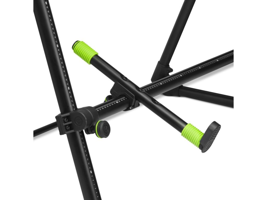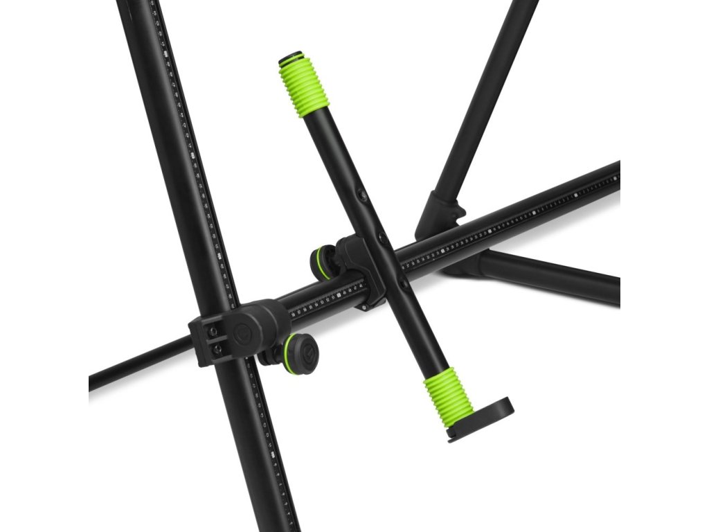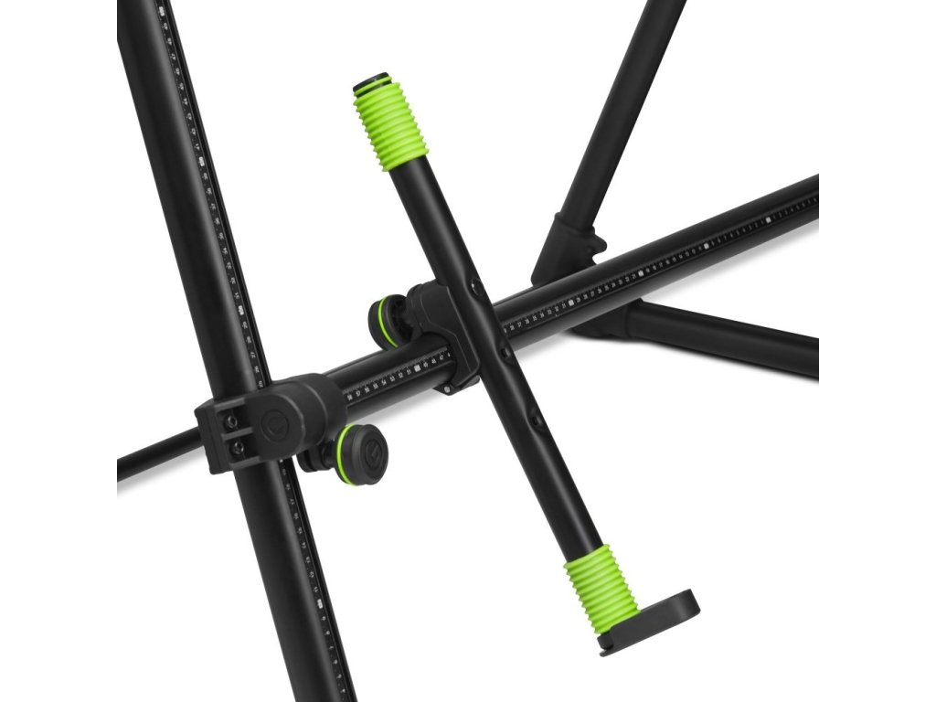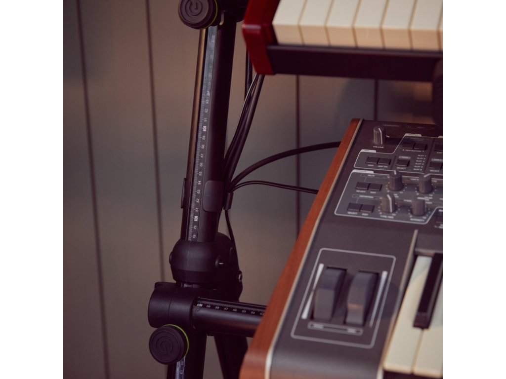 Statyw Multi Keyboardstand jest nie tylko niezwykle wygodny, ale także skonstruowany tak, aby wytrzymać. Jest wyposażony w dodatkowy zestaw wyższych przednich ograniczników dla większych klawiszy, które utrzymują je w bezpieczeństwie i stabilności, a także jest wykonany z lekkiego i wytrzymałego aluminium, które zapewnia trwałość. Dodatkowo jest dostarczany z prowadnicą kabli, która utrzymuje porządek w kablach, oraz z zestawem samoprzylepnych taśm pomiarowych, które zapewniają precyzyjne umieszczenie instrumentów.