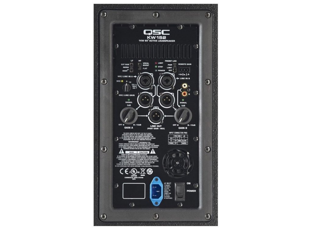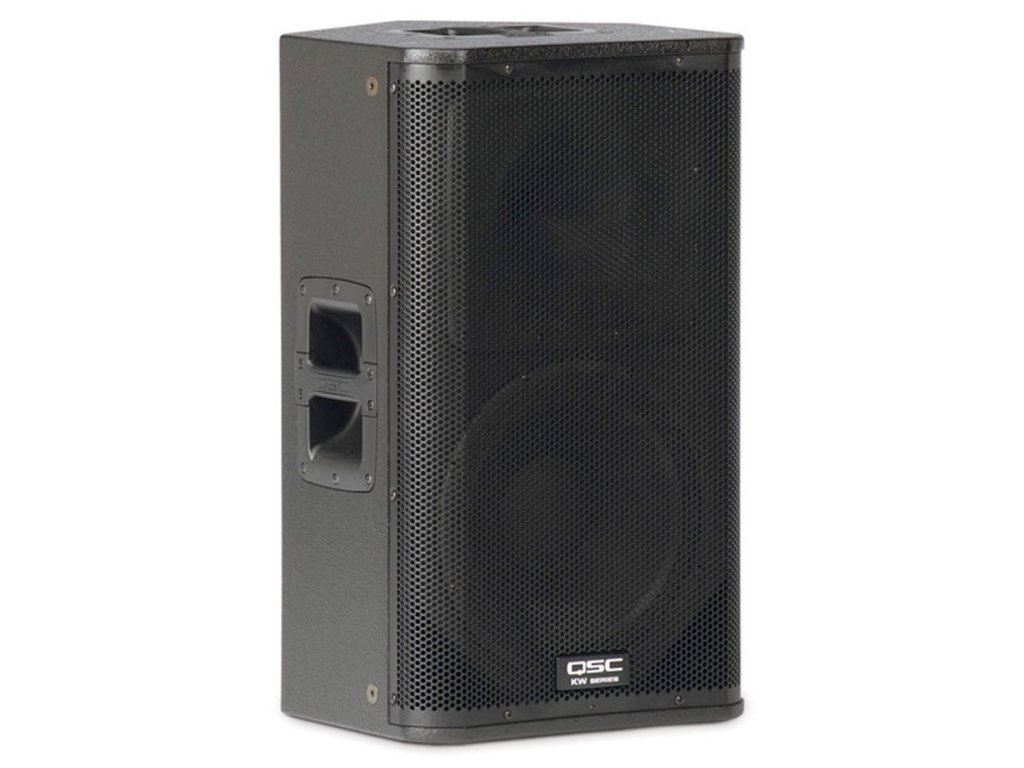 QSC KW122 • Aktywny dwudrożny zestaw głośnikowy, seria KW, głośniki 12“ + 1,75“, wzmacniacz bi-amp, moc 500+500W RMS, klasa D, jednostka DSP, maksymalny SPL 131dB, zakres częstotliwości 53Hz – 18kHz, korektor HF i LF, mikrofonowe/liniowe wejście XLR, liniowe wejście XLR, liniowe wejście RCA, liniowe wyjścia XLR, materiał: sklejka brzozowa.
