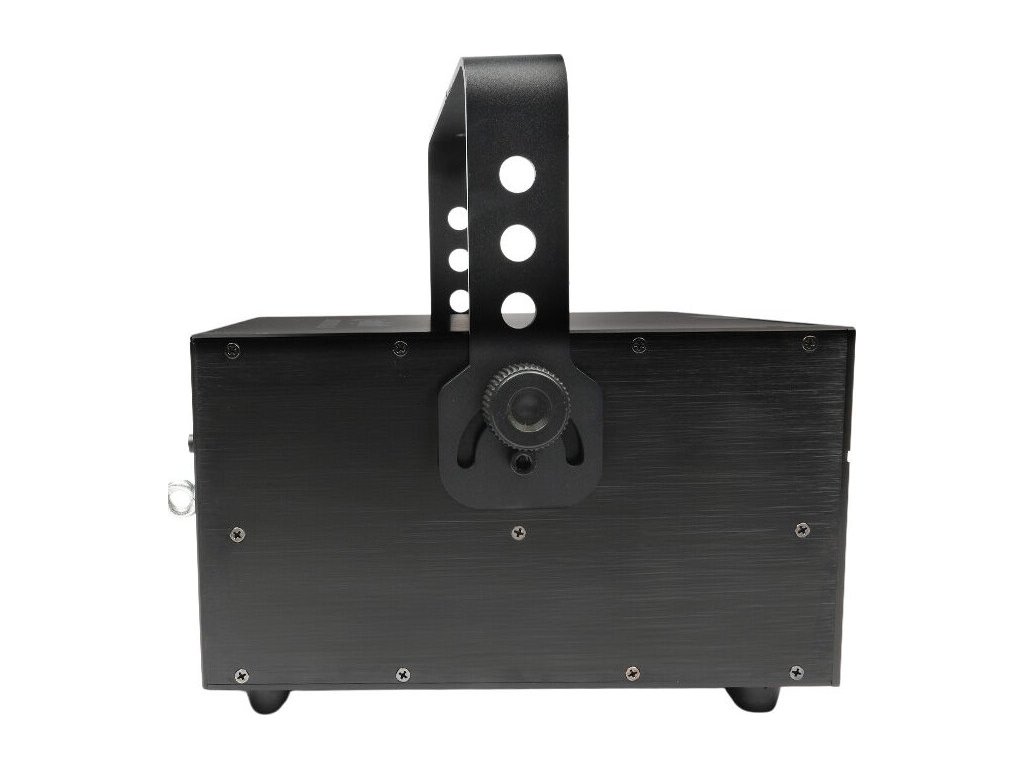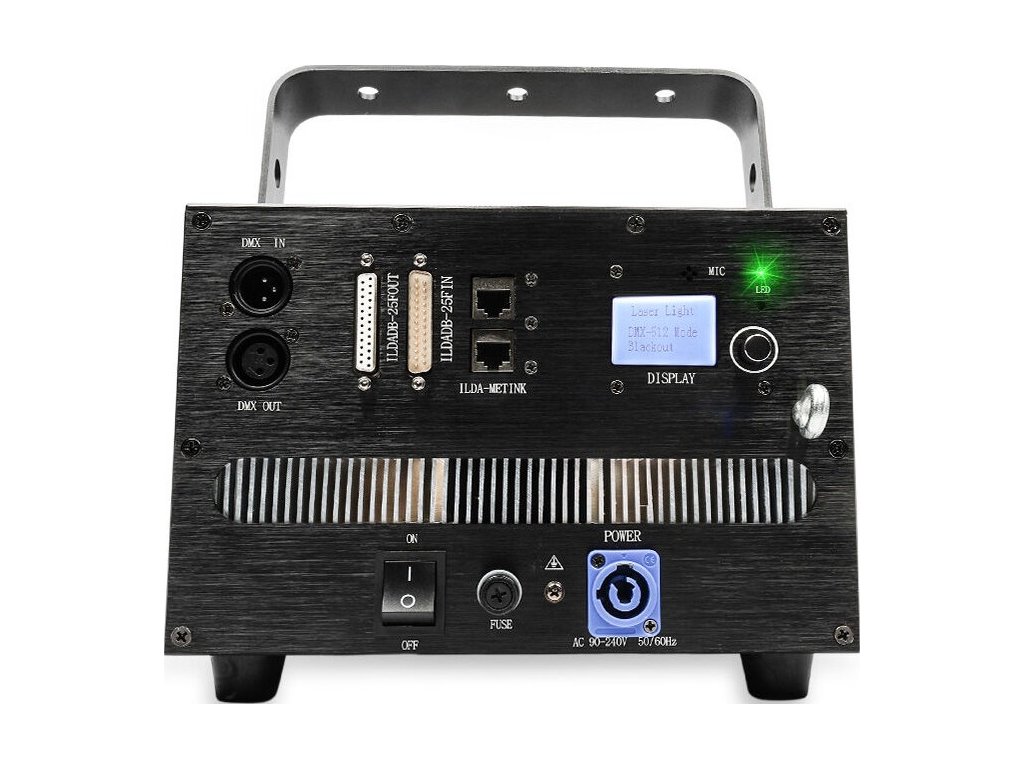 Z tyłu urządzenia znajduje się wyłącznik i gniazdo zasilające Powercon, 3-pinowe wejście i wyjście XLR umożliwiające sterowanie jednostką za pomocą sygnałów DMX oraz złącza ILDA (in/out). Dzięki nim możemy podłączyć projektor laserowy do komputera i – za pomocą specjalnego oprogramowania – samodzielnie projektować kolorowe wzory i animacje. Na tylnej ściance projektora znajduje się również panel sterowania urządzeniem. Składa się on z czytelnego wyświetlacza LCD i obrotowego pokrętła z funkcją przycisku, dzięki czemu możemy poruszać się po menu i wybierać parametry pracy jednostki.
