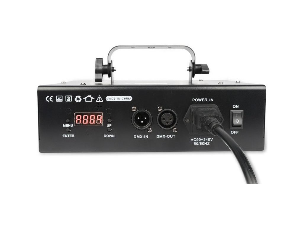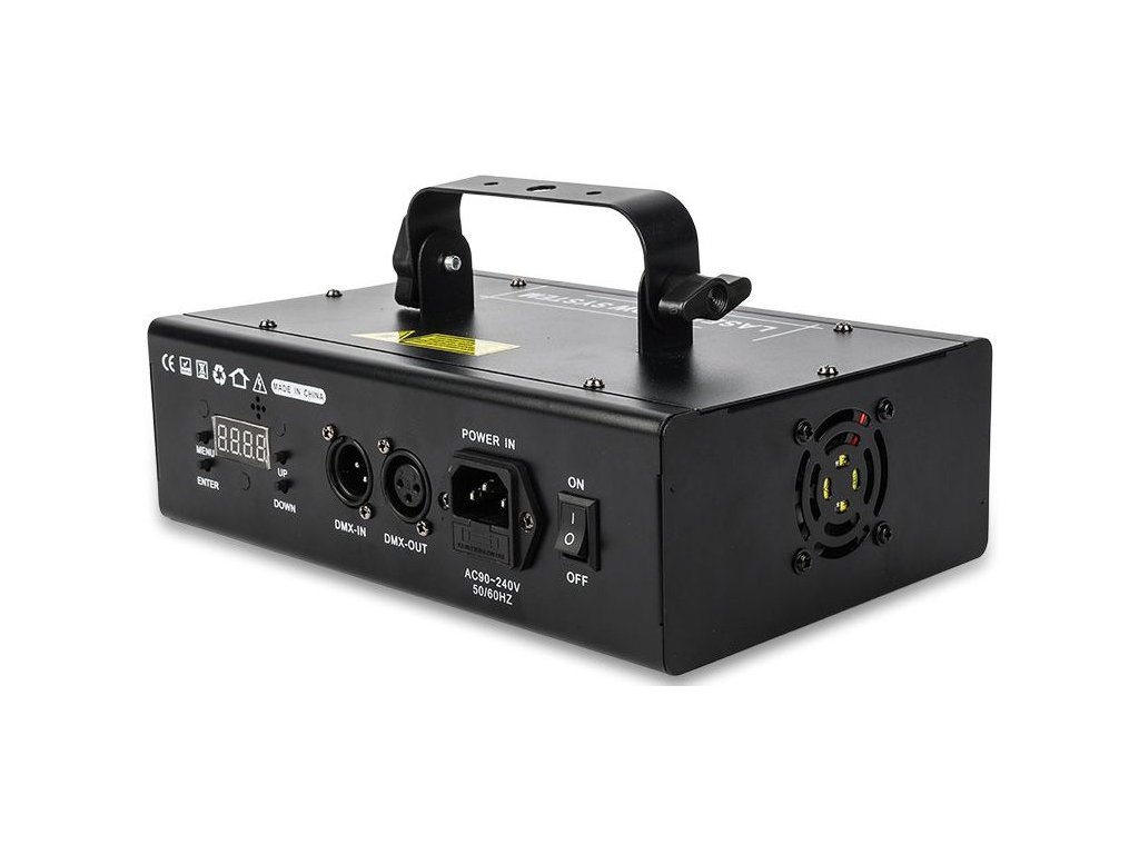 Komponenty elektroniczne lasera Light4Me Laser RGB Geometric 350mW są zamknięte w bardzo wytrzymałej, prostokątnej obudowie. Z tyłu znajduje się złącze zasilania oraz wejście i wyjście dla sygnałów sterujących DMX. W tej części znajduje się również panel sterowania w postaci cyfrowego wyświetlacza LED i czterech przycisków. Za ich pomocą możemy ustawić prędkość wyświetlania animacji laserowej, ustawić adres DMX projektora lub wybrać jeden z czterech trybów pracy: