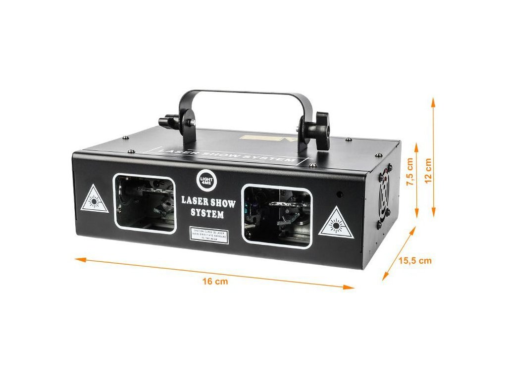 Light4Me Laser RGB Geometric 350mW to kompaktowy, bardzo łatwy w użyciu projektor laserowy, za pomocą którego możemy tworzyć interesujące pokazy świetlne. Projektor jest wyposażony w 3 lasery - czerwony, zielony i niebieski - o łącznej mocy 350 miliwatów i aż 51 wbudowanych efektów animacyjnych.