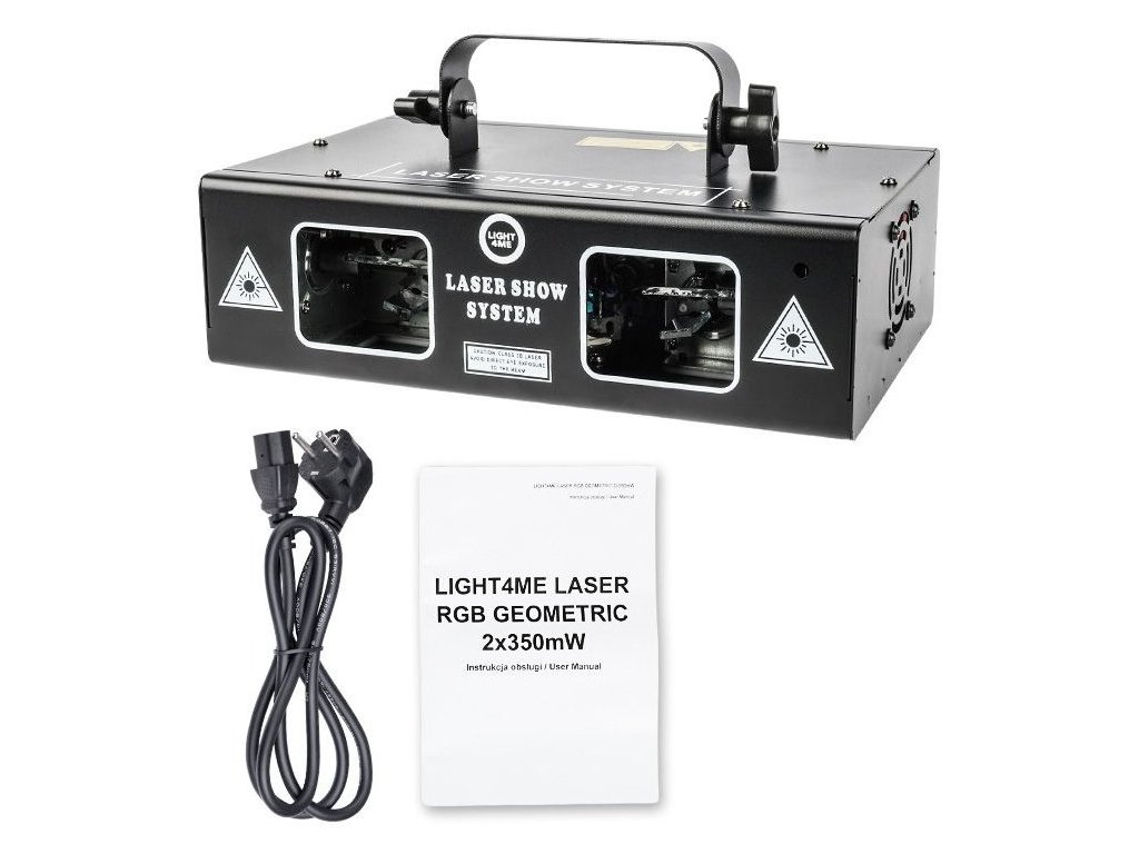 - W zestawie: Laser RGB Geometric 350mW, kabel zasilający, uchwyt montażowy, krótka instrukcja
