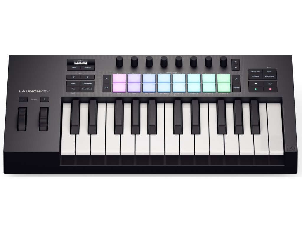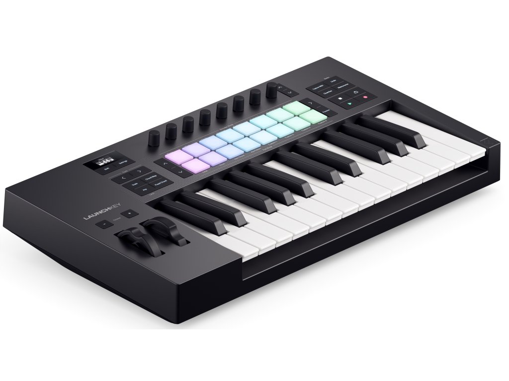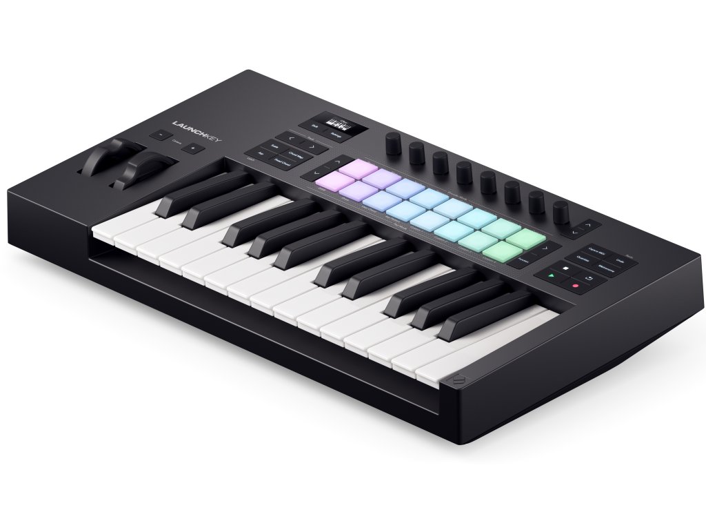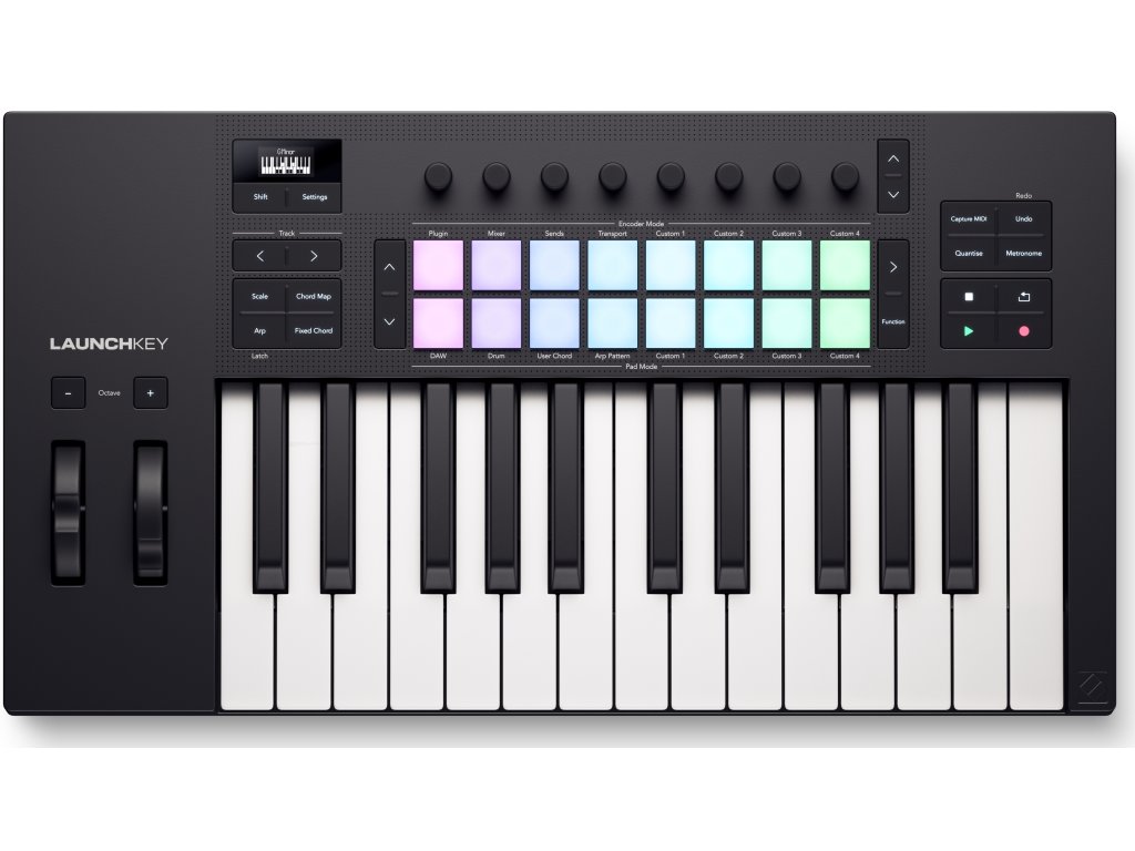 Novation Launchkey 25 to potężny kontroler DAW z klawiaturą typu synth, ośmioma enkoderami ciągłymi i 16 czułymi na nacisk padami do finger drummingu i uruchamiania klipów. Kontroler zawiera również kreatywne tryby Chord i Scale, które współpracują z wyświetlaczem OLED, aby ułatwić trzymanie się tonacji.