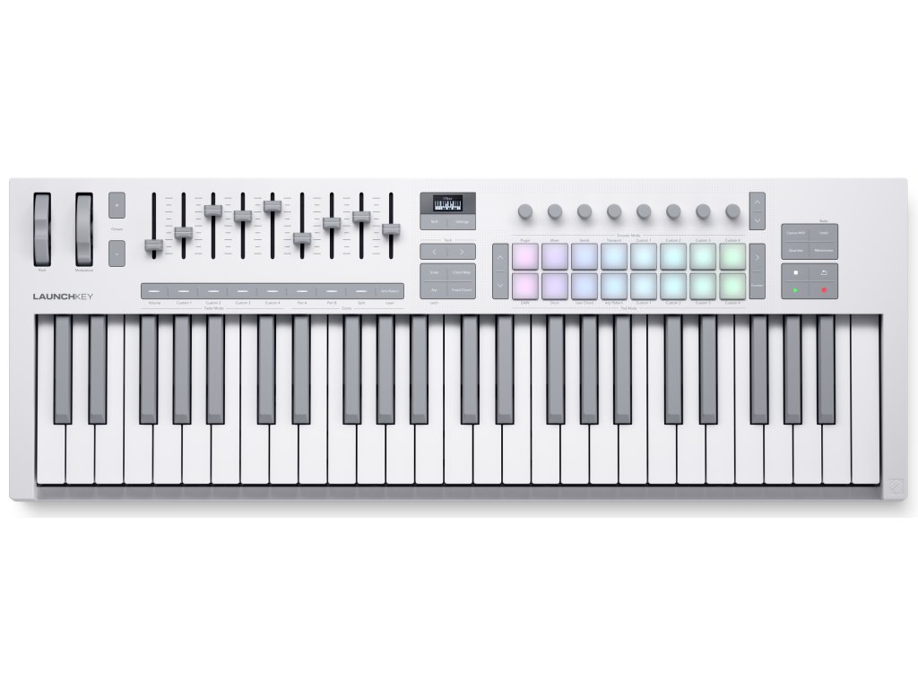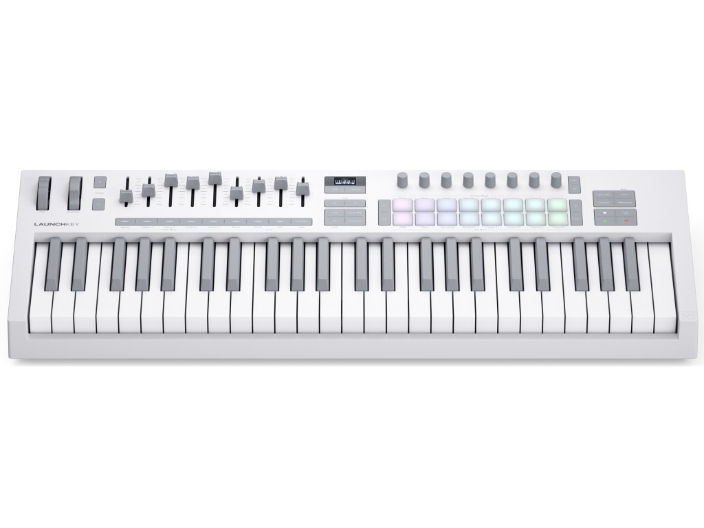 Novation Launchkey 49 to potężny kontroler DAW z półważoną klawiaturą typu waterfall, ośmioma ciągłymi enkoderami, dziewięcioma faderami i 16 czułymi na nacisk padami do finger drummingu i uruchamiania klipów. Kontroler zawiera również kreatywne tryby Chord i Scale, które współpracują z wyświetlaczem OLED, aby ułatwić trzymanie się tonacji.