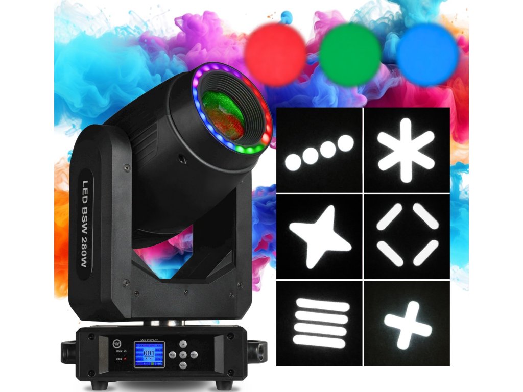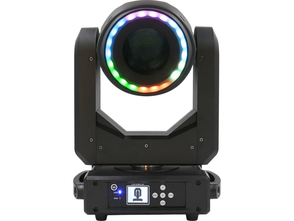 - Typ urządzenia: hybrydowa głowica obrotowa typu beam spot wash LED DMX z efektem ring i uchwytami montażowymi omega- Źródło światła: biała dioda LED 280W + 22x0,2W LED RGB 3w1 (efekt ring)