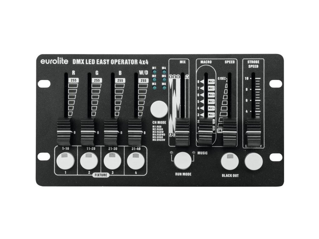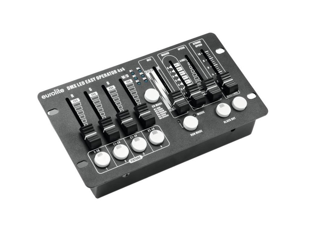 Prosty kontroler DMX do reflektorów LED. Łatwe sterowanie 4 reflektorami z diodami RGBW LED, którymi można sterować wspólnie lub indywidualnie. Oddzielne kanały sterowania dla poszczególnych kolorów (czerwony, zielony, niebieski i biały) oraz master. Różne tryby wyboru sekwencji kolorów poszczególnych kanałów DMX. Ręczne sterowanie za pomocą 4 potencjometrów suwakowych, 1 potencjometr do bezpośredniego przenikania kolorów RGBW. 8 automatycznych trybów pracy z regulowaną prędkością działania programu. Sterowanie muzyką za pomocą wbudowanego mikrofonu z regulowaną czułością. Efekt stroboskopowy z możliwością zmiany prędkości błysków i funkcja Blackout (natychmiastowe wyłączenie świecenia). Kompaktowy sterownik DMX odpowiedni do mobilnych akcji, produkcji muzycznych, klubów tanecznych i DJ-ów, prezentacji, pokazów itp.