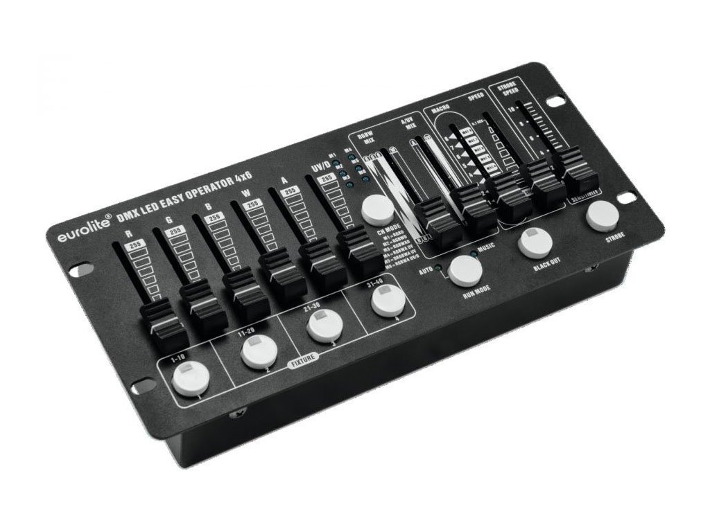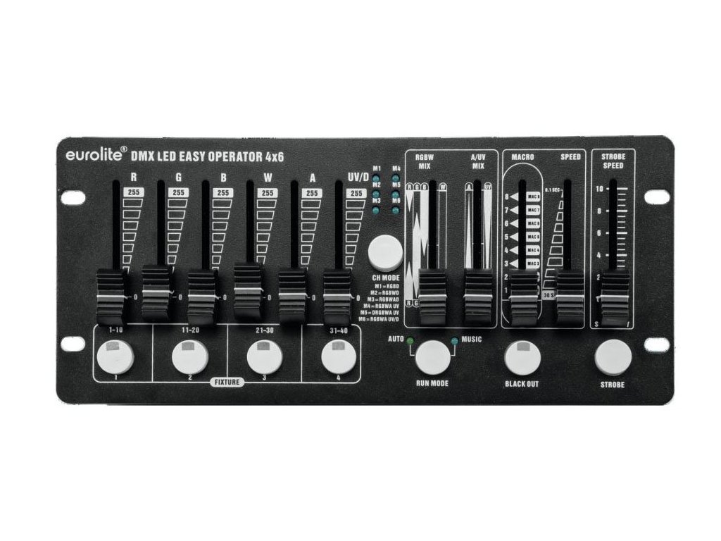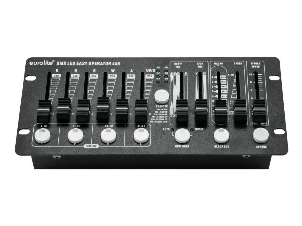 Praktyczny i kompaktowy kontroler DMX do reflektorów LED. Łatwe sterowanie 4 reflektorami z diodami RGBAW+UV LED, którymi można sterować wspólnie lub indywidualnie. Oddzielne kanały sterowania dla poszczególnych kolorów (czerwony, zielony, niebieski, pomarańczowy, biały i UV) oraz master. Różne tryby wyboru sekwencji kolorów poszczególnych kanałów DMX. Ręczne sterowanie za pomocą 6 potencjometrów suwakowych, 2 potencjometry do bezpośredniego przenikania kolorów RGBW oraz A/UV. 8 automatycznych trybów pracy z regulowaną prędkością działania programu. Sterowanie muzyką za pomocą wbudowanego mikrofonu z regulowaną czułością. Efekt stroboskopowy z możliwością zmiany prędkości błysków i funkcja Blackout (natychmiastowe wyłączenie świecenia). Kompaktowy sterownik DMX odpowiedni do mobilnych akcji, produkcji muzycznych, klubów tanecznych i DJ-ów, prezentacji, pokazów itp.