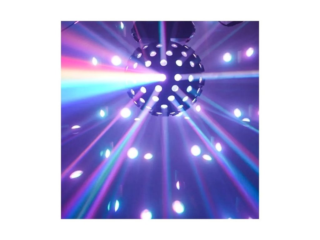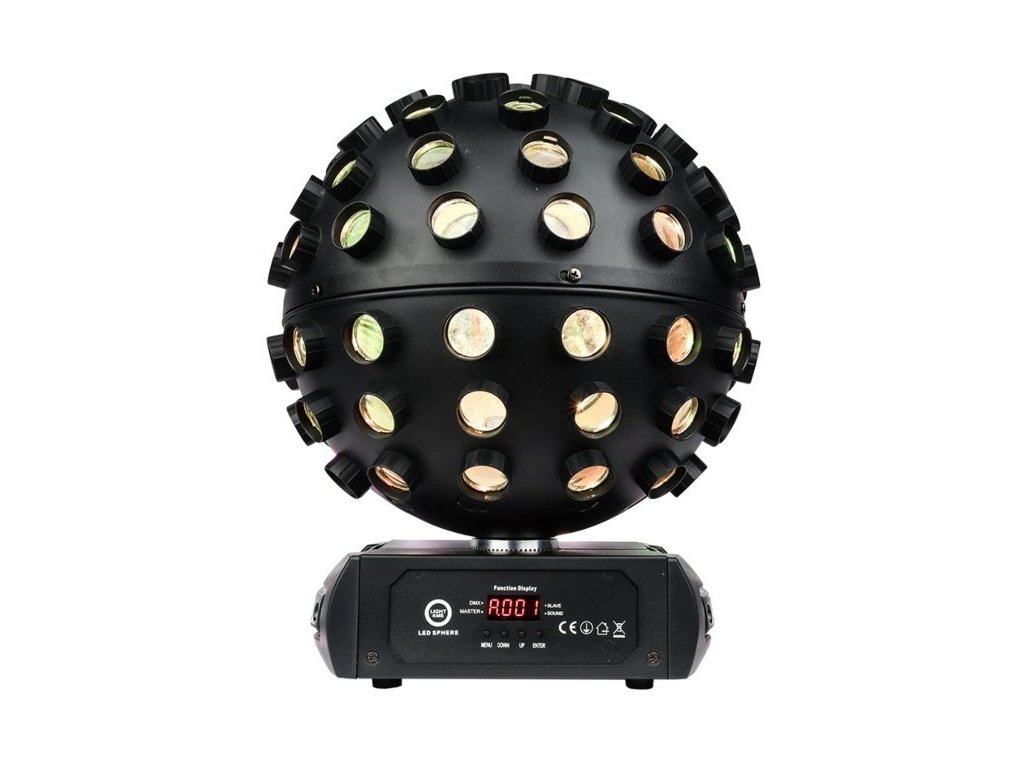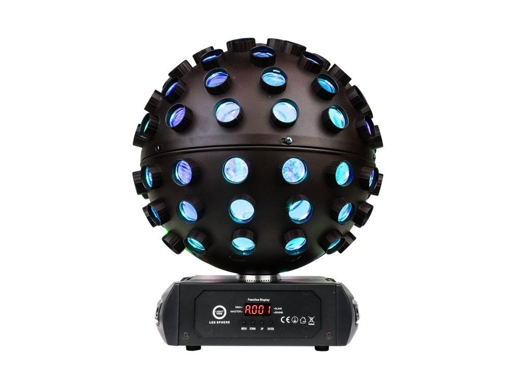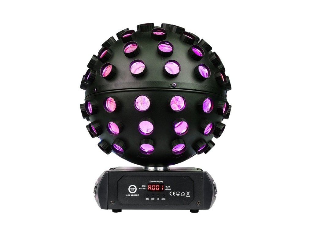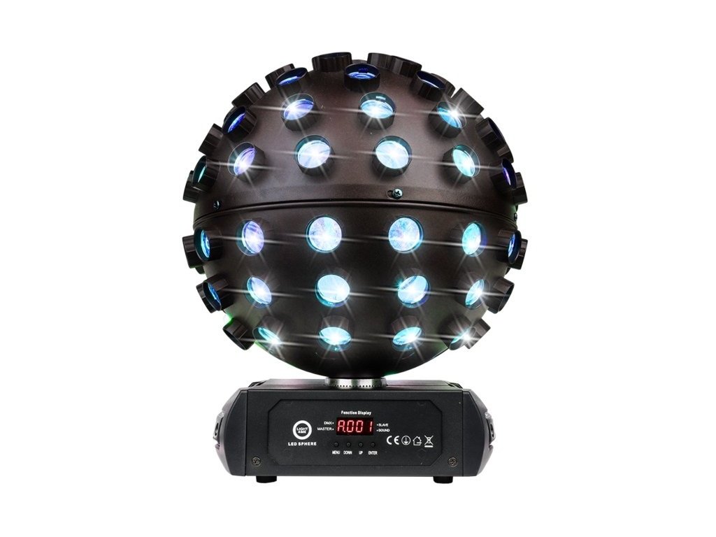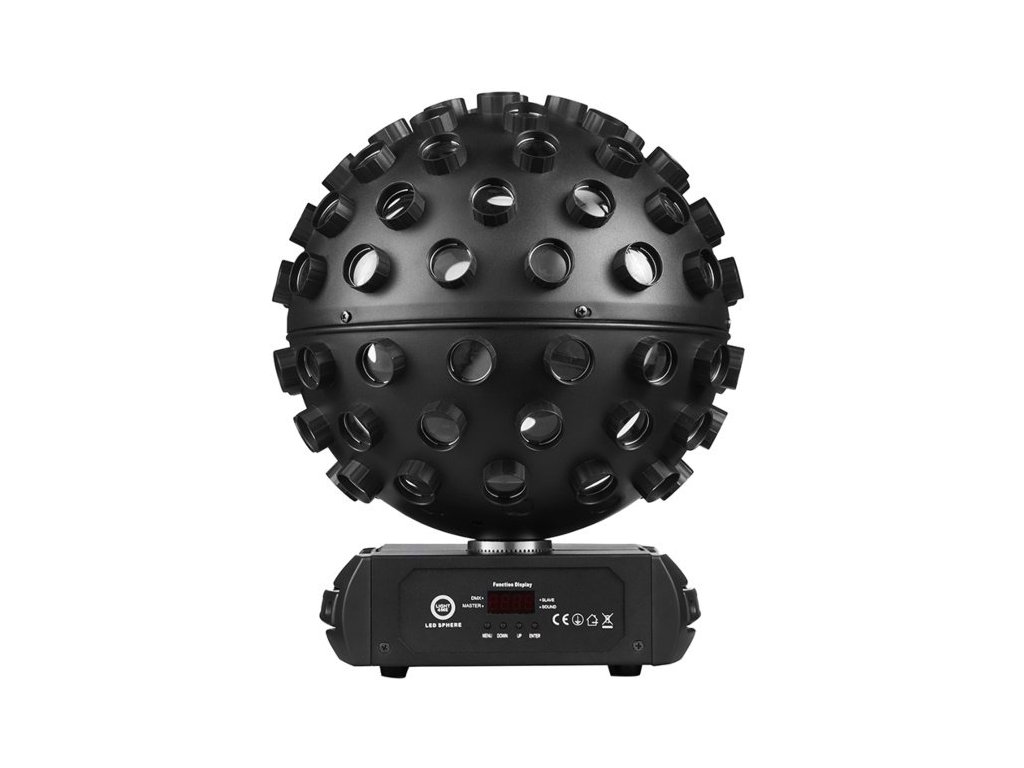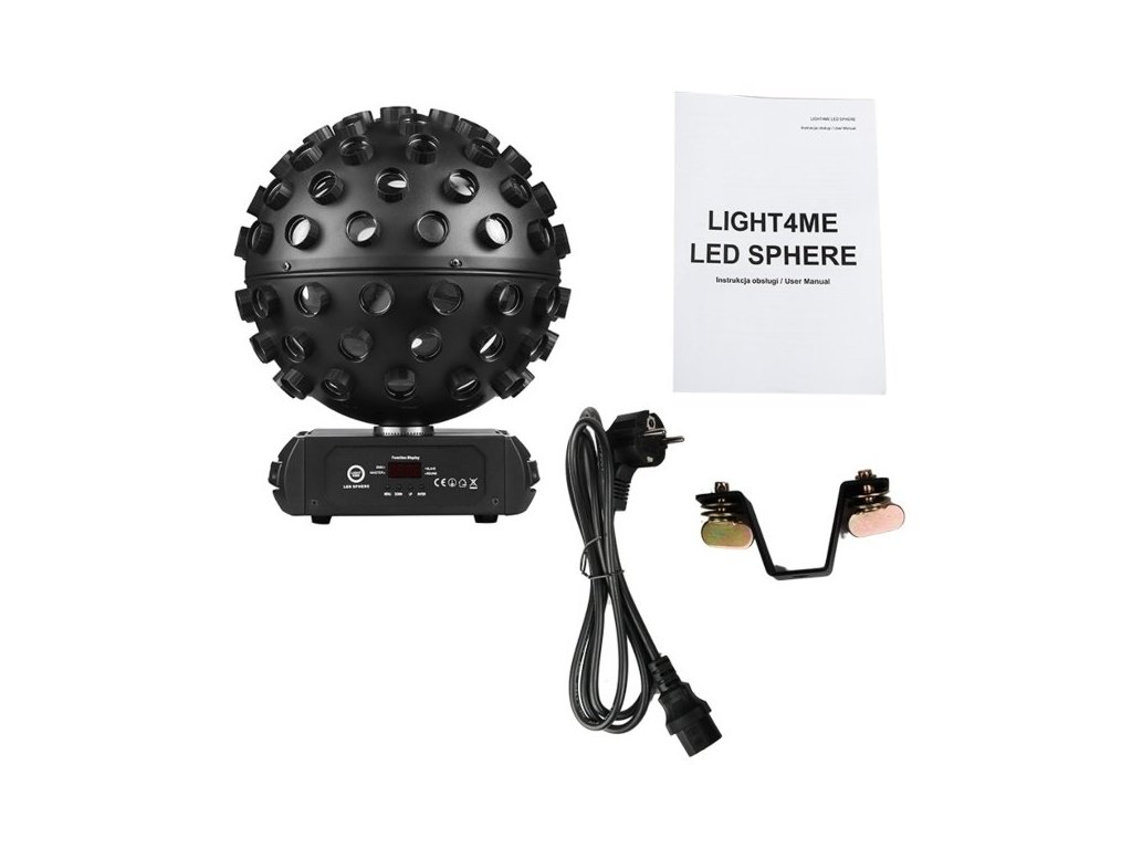 Dzięki ściemniaczowi o pełnym zakresie i regulowanej prędkości stroboskopu LIGHT4ME LED SPHERE umożliwia dostrojenie efektów świetlnych tak, aby odpowiadały charakterowi Twojego wydarzenia. Panel sterowania z wyświetlaczem LED i 4 przyciskami ułatwia szybką i łatwą konfigurację produktu.