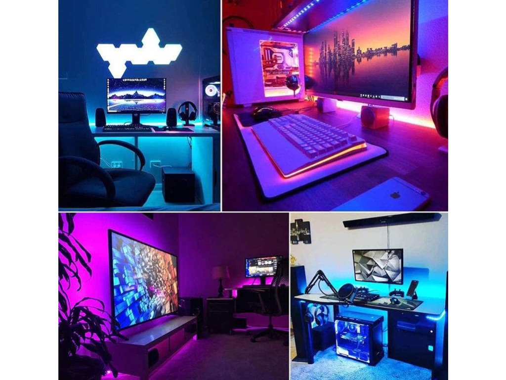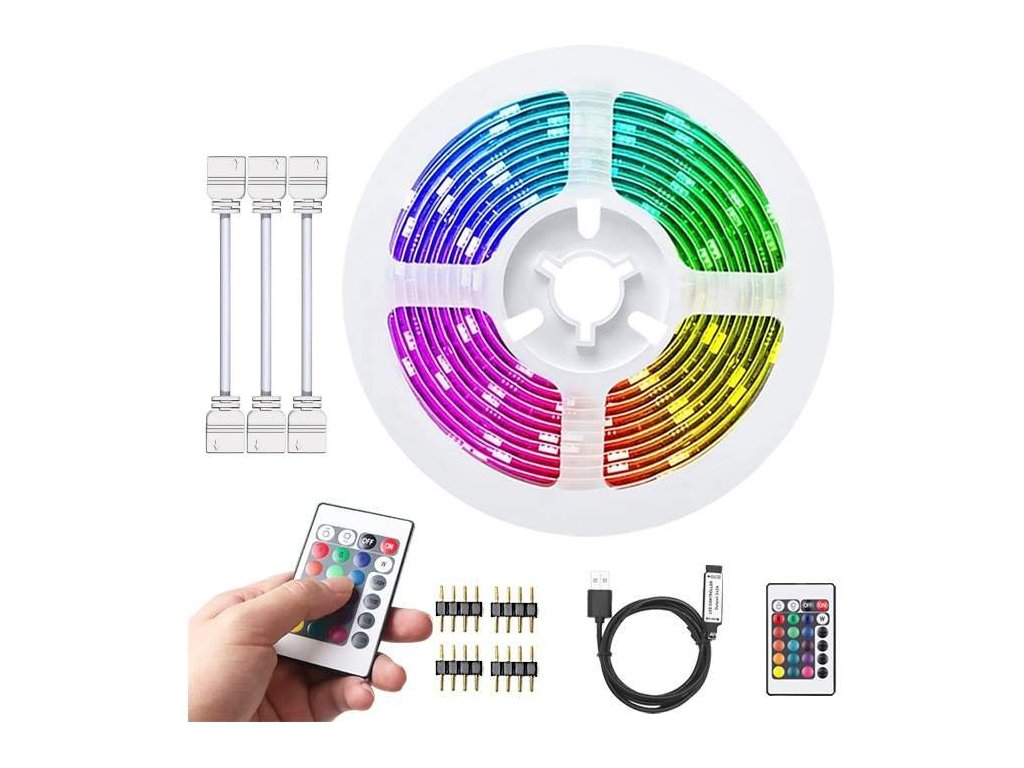 Uniwersalny pasek LED z diodami SMD RGB, odpowiedni do podświetlania telewizora, stołu, blatu kuchennego, łóżka, witryny sklepowej lub perkusji, gitary i wzmacniacza basowego. Zestaw zawiera cztery półmetrowe paski LED, trzy narożne łączniki do tworzenia wzorów, adapter USB i pilot zdalnego sterowania do wygodnego włączania i regulacji z kanapy. Do dyspozycji będziesz miał niezliczone kombinacje kolorów, ściemnianie, stroboskop i wiele innych efektów.