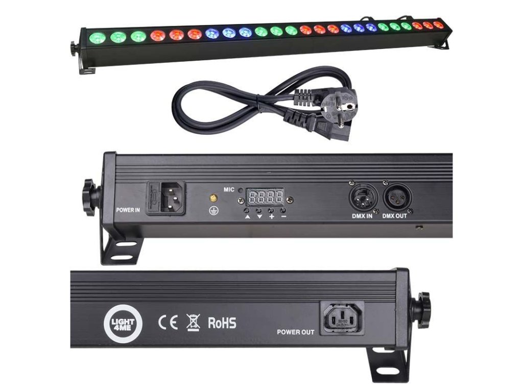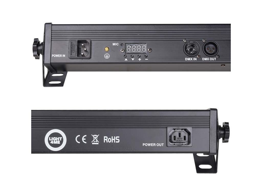 Listwa LED BAR Light4Me Deco jest wyposażona w 24 mocne, 3-watowe diody (3 w 8 sekcjach), pracujące ze światłem w palecie kolorów RGB. Na tylnym panelu znajdują się gniazda zasilania (w tym tzw. „pass it on” umożliwiające przesyłanie napięcia bezpośrednio z urządzenia do urządzenia), wejście i wyjście DMX oraz panel sterowania z cyfrowym wyświetlaczem i czterema przyciskami. Za ich pomocą możemy zmieniać ustawienia w menu, a także wybrać jeden z czterech trybów pracy, które nas interesują:
