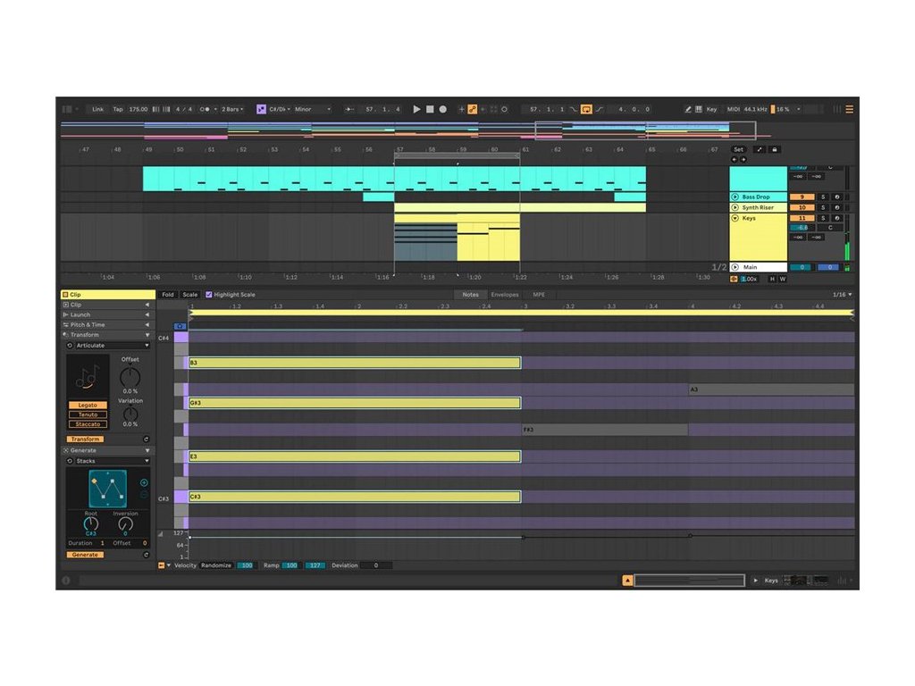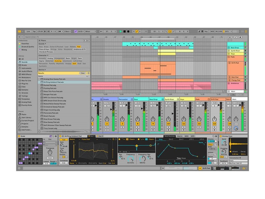 Do sekwencjonowania muzyki można użyć liniowego widoku Arrangement View lub widoku Session View, gdzie można improwizować i testować pomysły bez ograniczeń w osi czasu. Dzięki Live warping możesz zmieniać tempo i czas dowolnego dźwięku w czasie rzeczywistym podczas pracy. Nagrywaj instrumenty MIDI lub audio, wokale lub inne dźwięki i używaj kreatywnych funkcji aplikacji Live, aby udoskonalić swoje występy, inspirować nowe pomysły lub przekształcać spontaniczne momenty w muzykę. Użyj funkcji Sound Similarity, aby znaleźć presety i dźwięki porównywalne z tymi, z którymi aktualnie pracujesz. Stwórz swoje brzmienie dzięki bogatej ofercie narzędzi i efektów Live lub stwórz coś nowego z różnorodnej kolekcji pakietów. A ponieważ oprogramowanie pozwala na wykonywanie wszystkiego w czasie rzeczywistym i jest nieskończenie konfigurowalne, jest idealne do występów na żywo i pracy studyjnej. Na koniec jest Push: ekspresyjne narzędzie sprzętowe, które daje ci niezależność od komputera, dzięki czemu możesz w pełni poświęcić się muzyce.