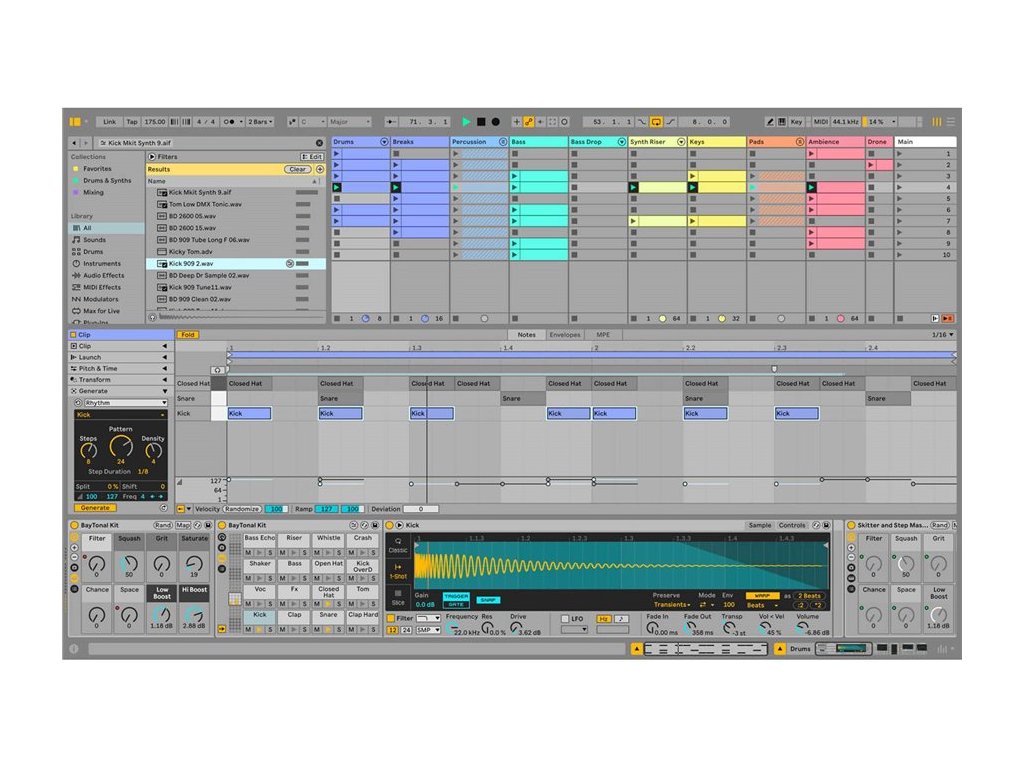 Do sekwencjonowania muzyki można użyć liniowego widoku Arrangement View lub widoku Session View, gdzie można improwizować i testować pomysły bez ograniczeń w osi czasu. Dzięki Live warping możesz zmieniać tempo i czas dowolnego dźwięku w czasie rzeczywistym podczas pracy. Nagrywaj instrumenty MIDI lub audio, wokale lub inne dźwięki i używaj kreatywnych funkcji aplikacji Live, aby udoskonalić swoje występy, inspirować nowe pomysły lub przekształcać spontaniczne momenty w muzykę. Użyj funkcji Sound Similarity, aby znaleźć presety i dźwięki porównywalne z tymi, z którymi aktualnie pracujesz. Stwórz swoje brzmienie dzięki bogatej ofercie narzędzi i efektów Live lub stwórz coś nowego z różnorodnej kolekcji pakietów. A ponieważ oprogramowanie pozwala na wykonywanie wszystkiego w czasie rzeczywistym i jest nieskończenie konfigurowalne, jest idealne do występów na żywo i pracy studyjnej. Na koniec jest Push: ekspresyjne narzędzie sprzętowe, które daje ci niezależność od komputera, dzięki czemu możesz w pełni poświęcić się muzyce.