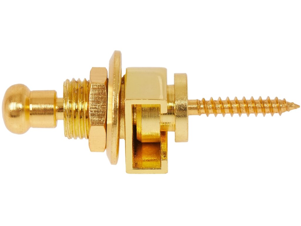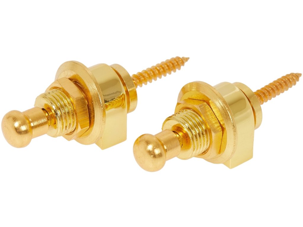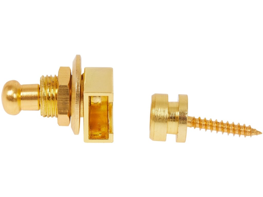 Zestaw zamków zabezpieczających firmy Razzor w złotym wykończeniu, które zapobiegają wysunięciu się instrumentu z paska i jego uszkodzeniu. Pasuje do wszystkich pasków gitarowych i basowych.