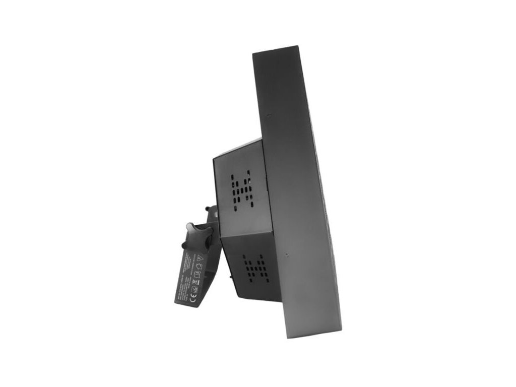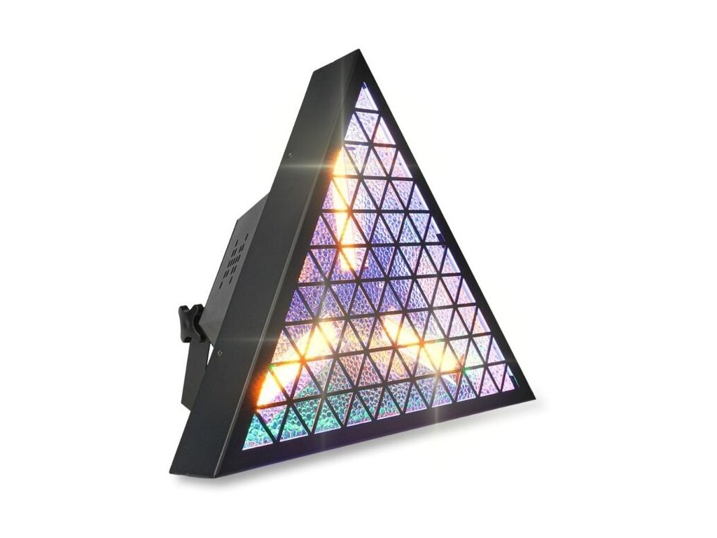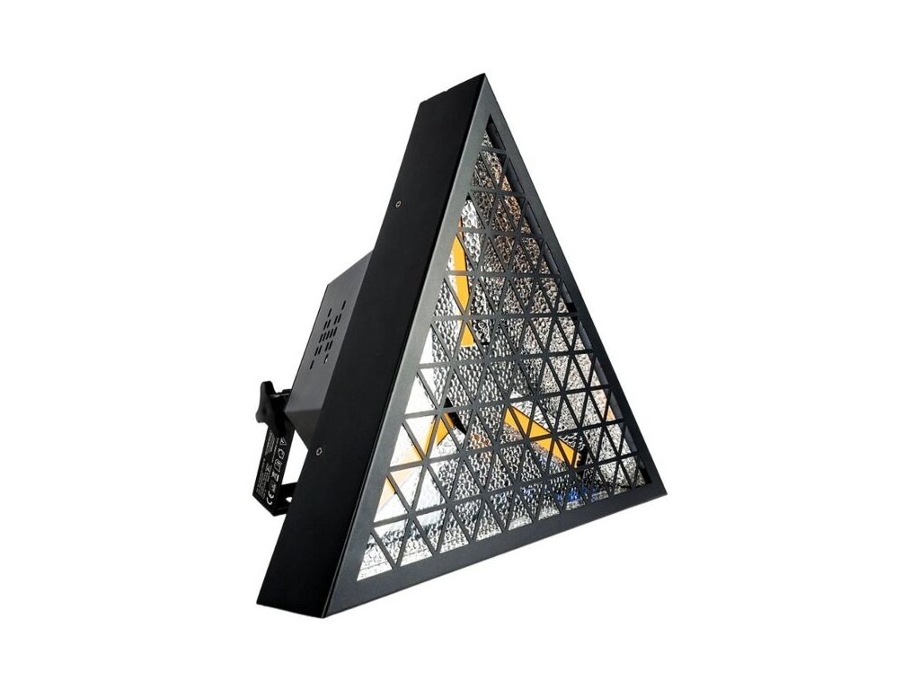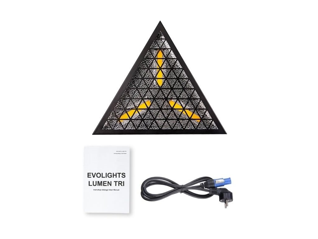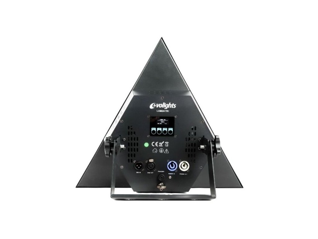Oprawy EVOLIGHTS LUMEN TRI mają stylową czarną obudowę z efektowną trójkątną kratką, która bardzo dobrze prezentuje się na scenie. Reflektor jest nowoczesny, a jednocześnie przypomina klasyczny design sprzed kilkudziesięciu lat. Solidna obudowa jest wyposażona w wspornik montażowy, który umożliwia instalację reflektora na statywach, konstrukcjach kratownicowych i rampach oświetleniowych. Z tyłu znajduje się praktyczny panel sterowania z czytelnym wyświetlaczem OLED i 4 dotykowymi przyciskami, a także wejście/wyjście powercon, które umożliwia łączenie napięcia zasilającego bezpośrednio z jednego urządzenia do drugiego.