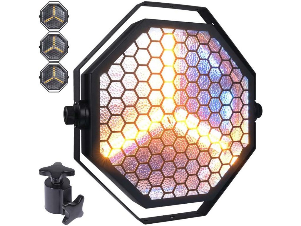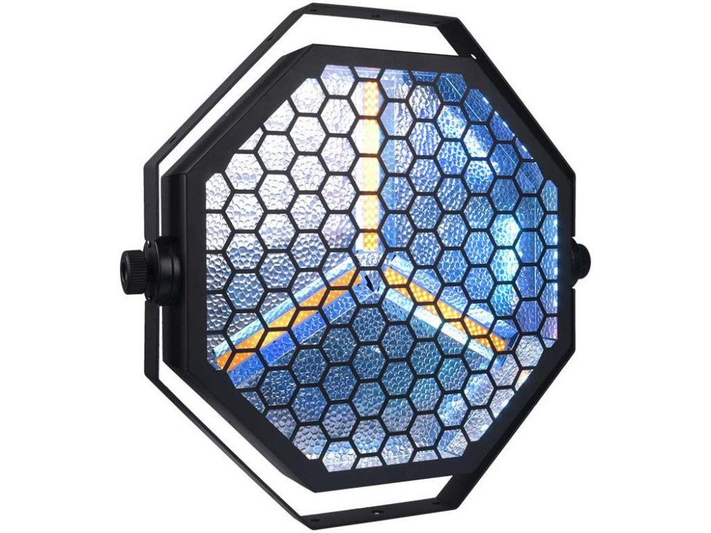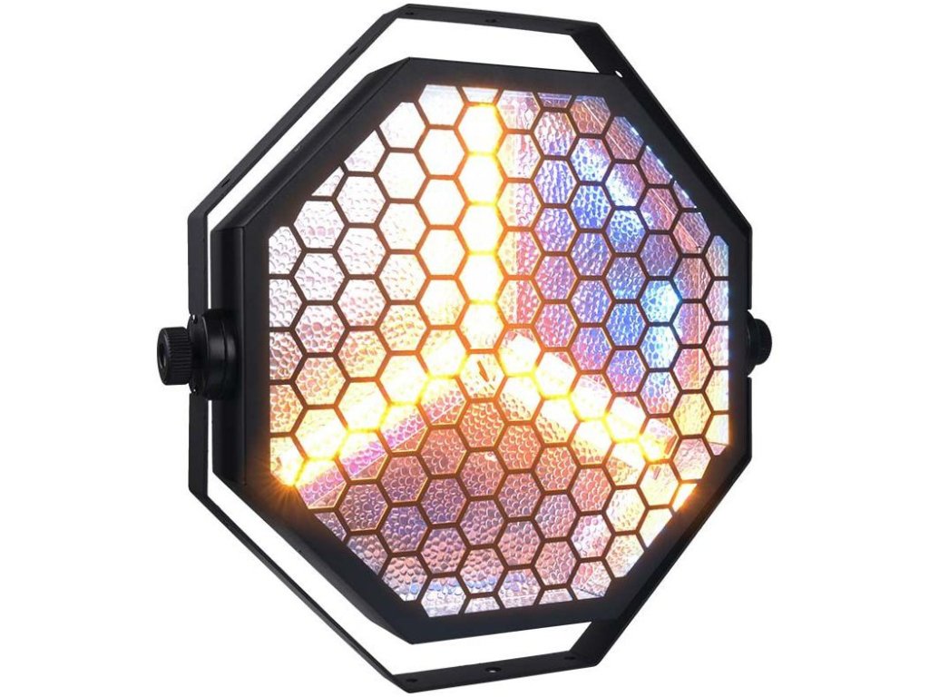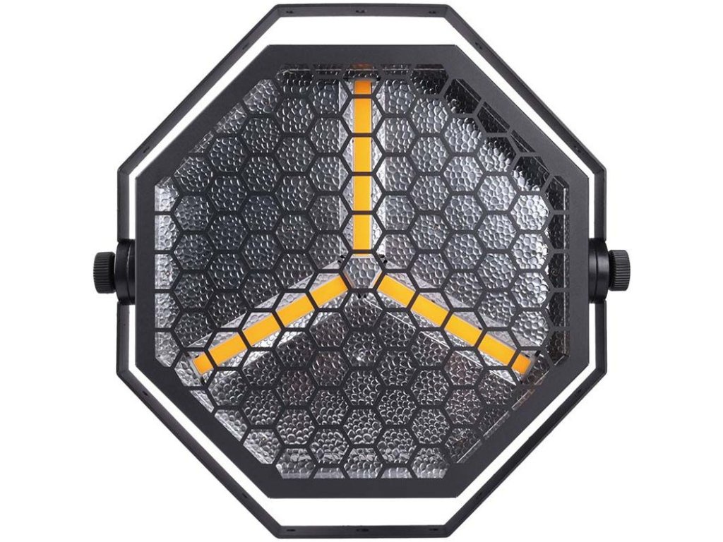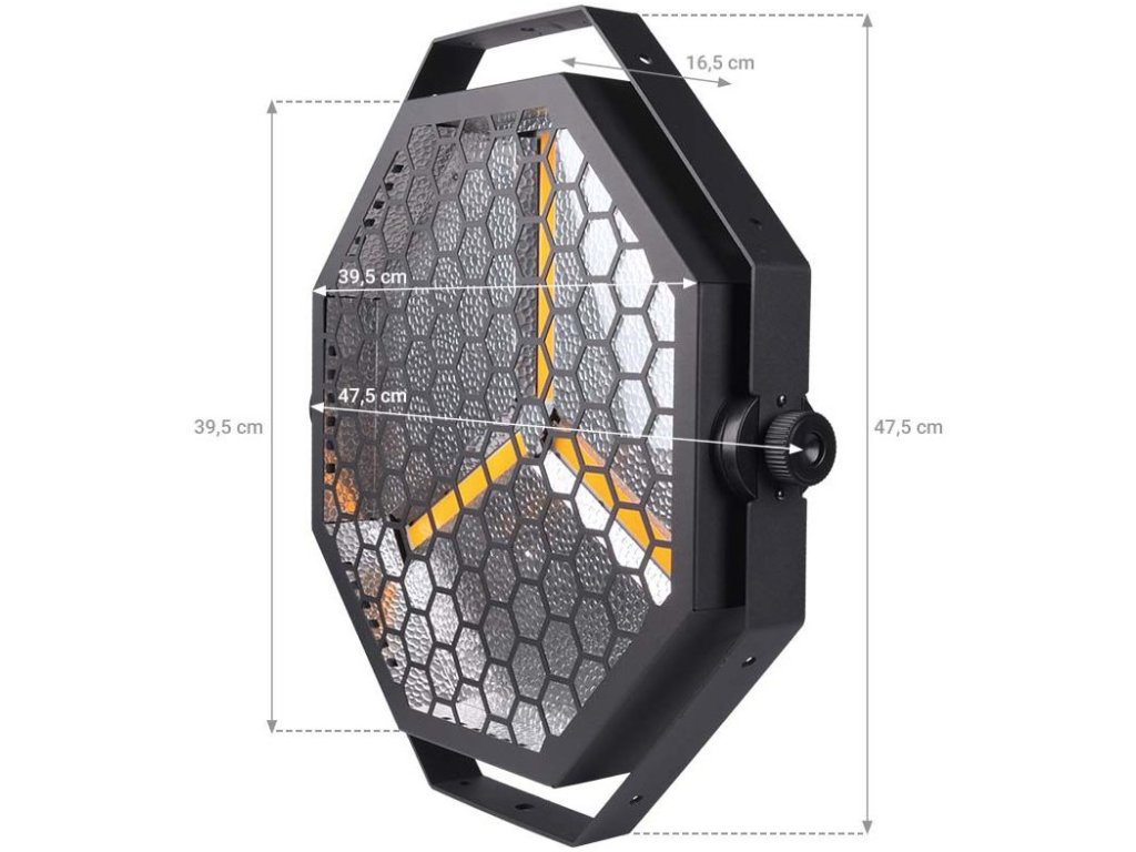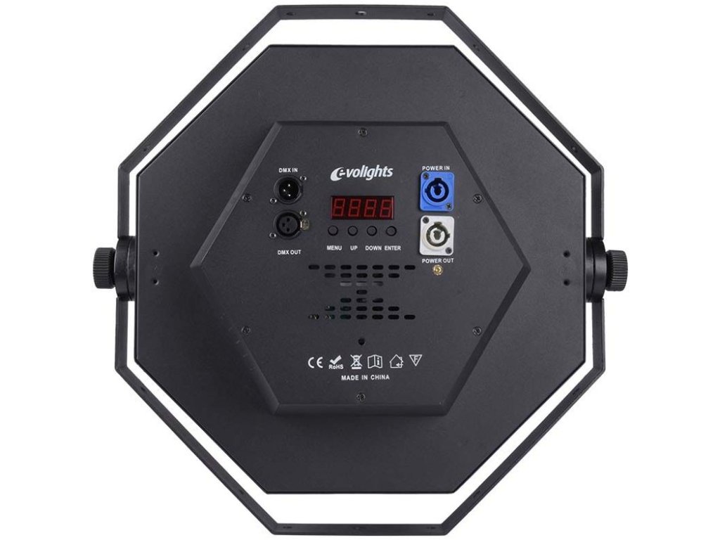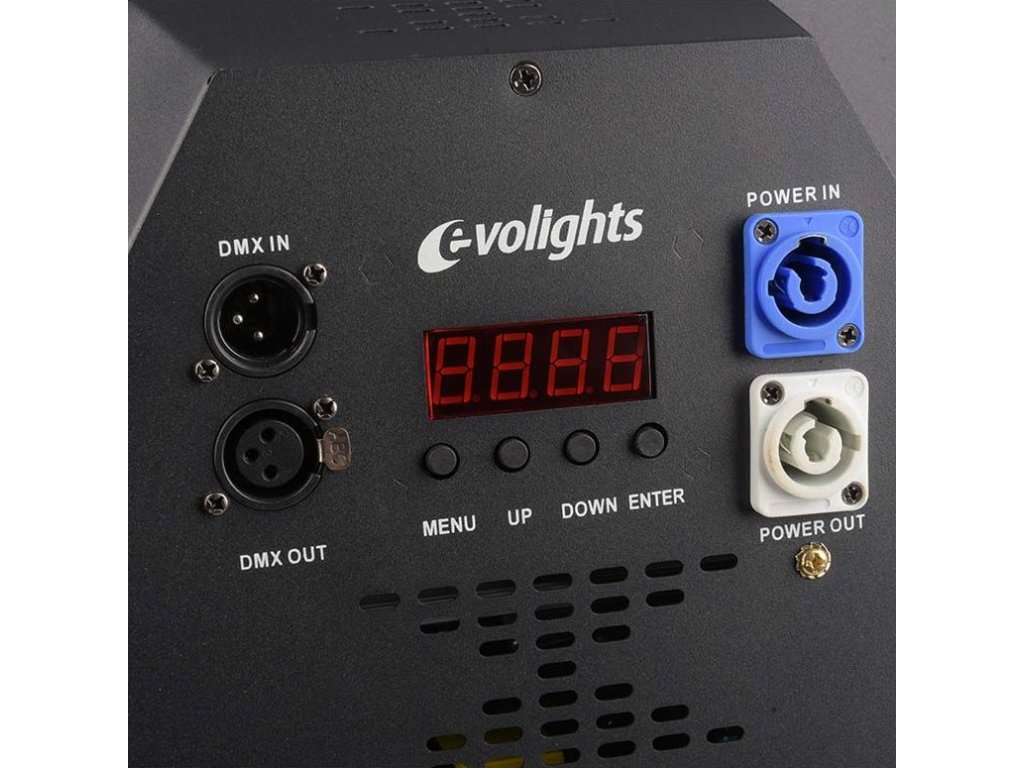 Evolights Lumeno posiada stylową obudowę z efektowną przednią kratką o strukturze plastra miodu, która bardzo dobrze prezentuje się na scenie. Reflektor jest nowoczesny, a jednocześnie nawiązuje do klasycznego designu sprzed kilku dekad. Solidna obudowa jest wyposażona w uchwyt montażowy, który umożliwia instalację reflektora na statywach, konstrukcjach kratownicowych i rampach oświetleniowych. Z tyłu znajduje się praktyczny panel sterowania z czytelnym wyświetlaczem LCD oraz 3-pinowe wejście i wyjście XLR dla łatwego sterowania DMX.