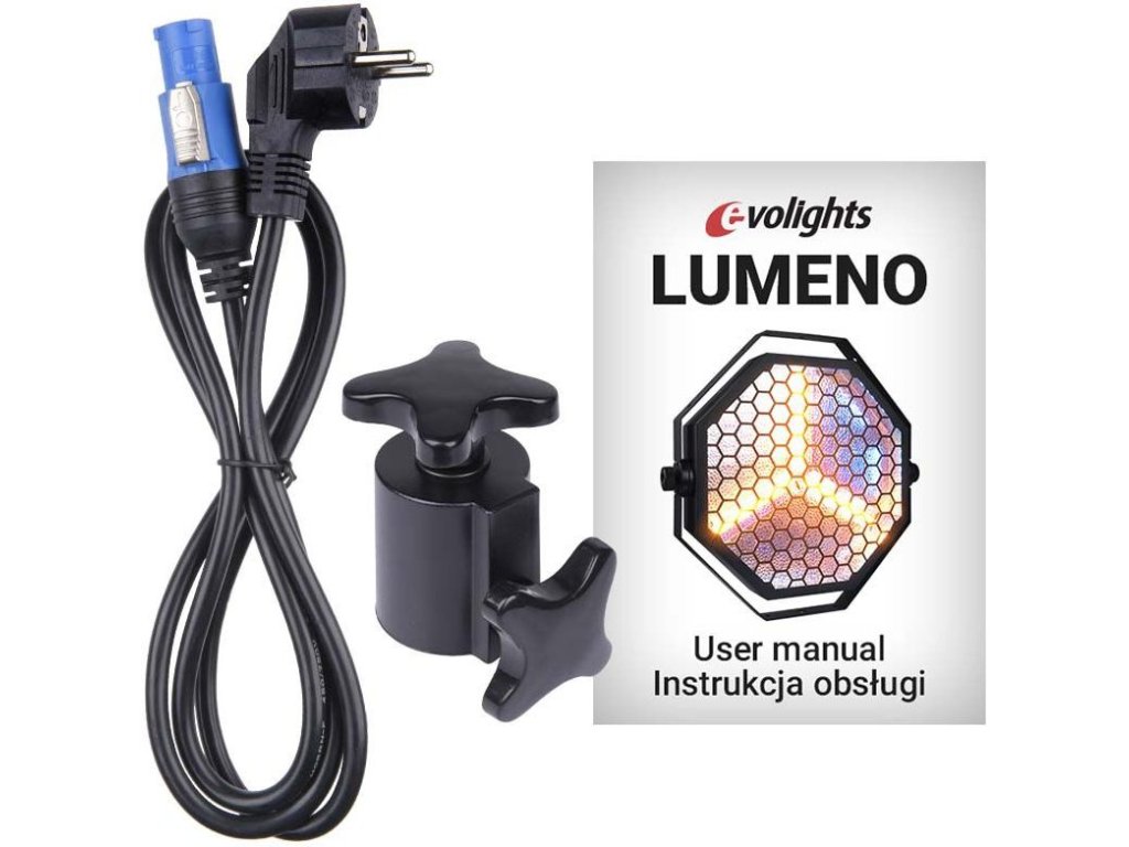 - W zestawie: Evolights Lumeno, kabel DMX, kabel zasilający, uchwyt montażowy, uchwyt statywowy, skrócona instrukcja obsługi
