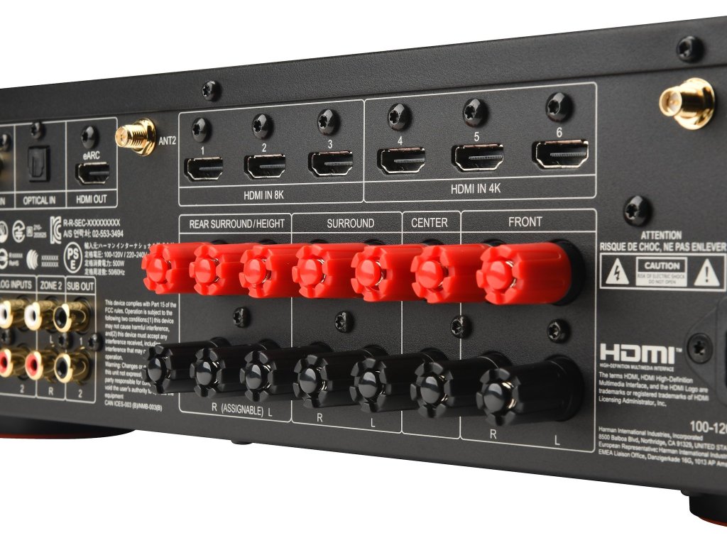- Wejścia HDMI 2.1, HDCP 2.3: 3 z obsługą ultra HD wideo 8K / 60 Hz i 4K / 120 Hz, HDR 10+, Dolby Vision