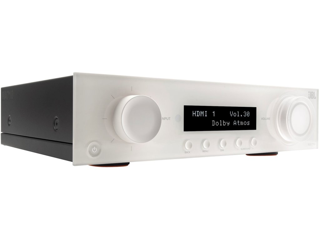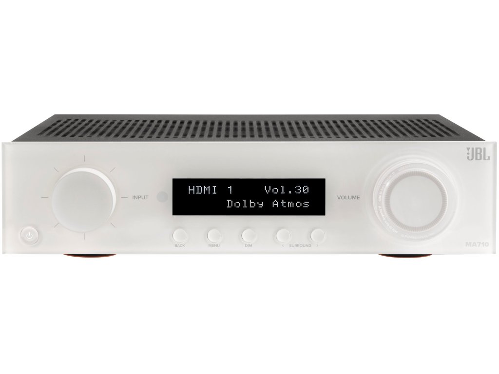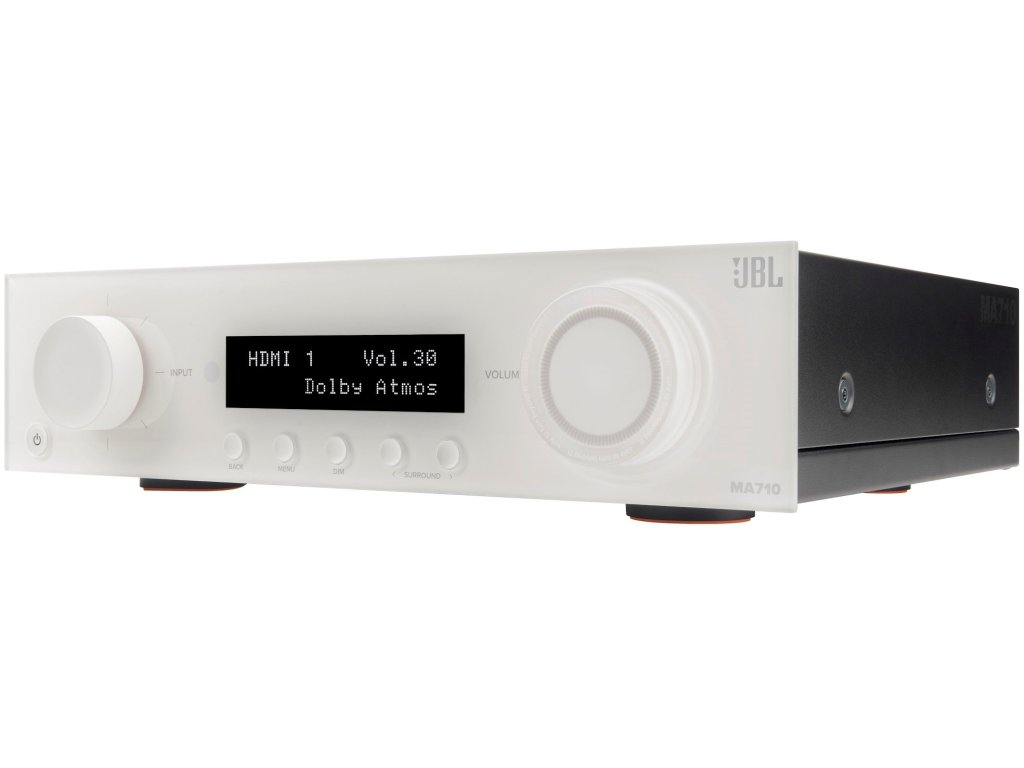 Dzięki natywnemu dekodowaniu Dolby ATMOS i DTS-X oraz 24-bitowym przetwornikom C/A o wysokiej rozdzielczości 192 kHz, MA710 może zmienić zwykły salon w prawdziwą salę kinową z potężnym, wciągającym dźwiękiem. W zależności od możliwości przestrzennych można stworzyć otaczającą scenę dźwiękową w systemie z 7.2 kanałami lub wykorzystać możliwość przekierowania dwóch kanałów na pozycję górnych głośników ATMOS (system 5.2.2), które mogą być umieszczone jako przednie lub środkowe. Kanały te potrafią skierować dźwięk w stronę słuchacza z sufitu, tworząc wciągający dźwięk dobiegający ze wszystkich stron, dokładnie tak, jak zamierzali to mistrzowie dźwięku z czołowych studiów filmowych w swoich hitach. Dla górnych dwóch kanałów można wykorzystać głośniki zainstalowane w konstrukcji sufitowej lub po prostu wybrać specjalne moduły ATMOS JBL STAGE 240H, które wystarczy położyć na kompatybilnych głośnikach przednich (np. JBL STAGE 260F i 280F). Dźwięk będzie wówczas emitowany z głośników pod kątem do sufitu, od którego fale dźwiękowe odbiją się w stronę słuchacza. Jest to proste, estetyczne i nie wymaga żadnej ingerencji w konstrukcję sufitu. Oglądanie filmów z Netflixa i granie w najnowsze gry już nigdy nie będzie takie samo.