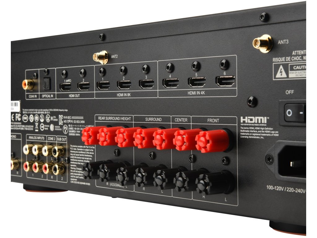 - Wejścia HDMI 2.1, HDCP 2.3: 3 z obsługą ultra HD wideo 8K / 60 Hz i 4K / 120 Hz, HDR 10+, Dolby Vision