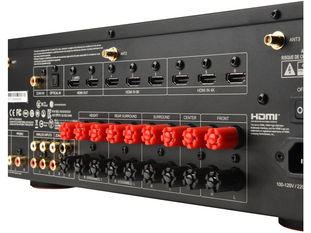 - Wejścia HDMI 2.1, HDCP 2.3: 3 z obsługą ultra HD wideo 8K / 60 Hz i 4K / 120 Hz, HDR 10+, Dolby Vision