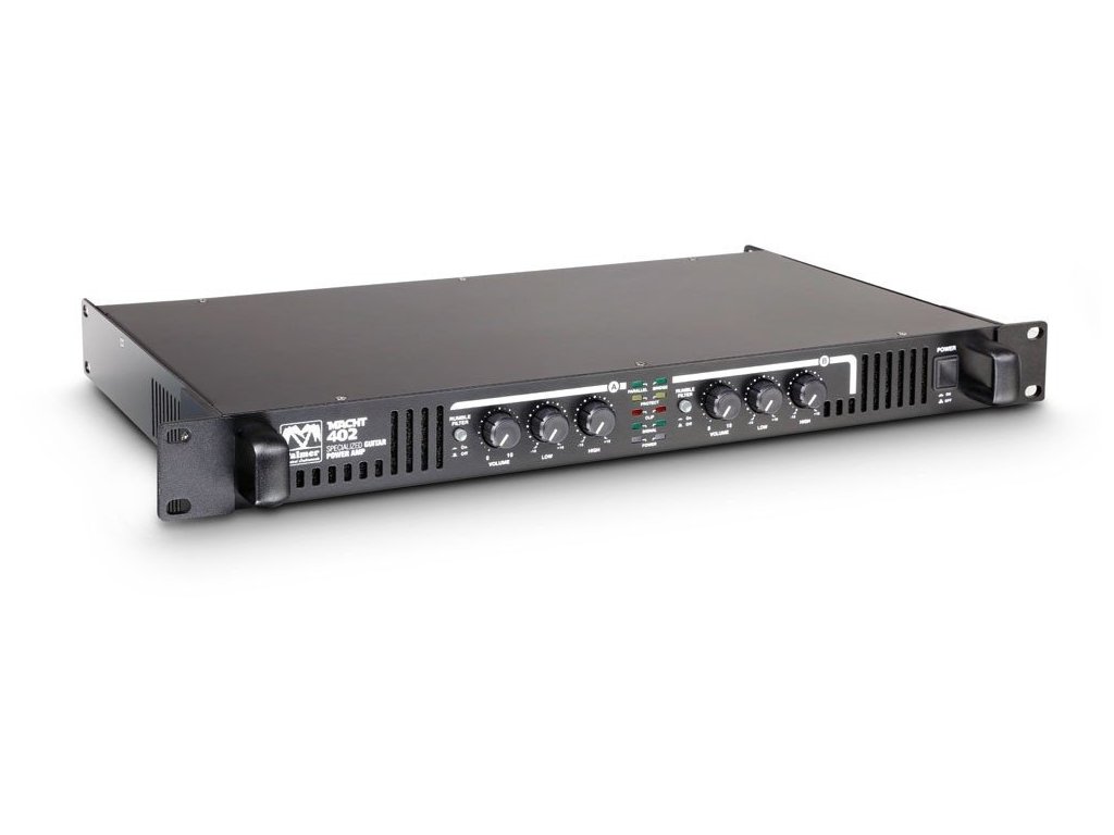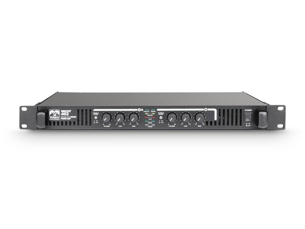 Palmer MACHT 402 to 19-calowy wzmacniacz stereo, który został specjalnie opracowany do użytku z gitarami. Zapewnia 200 watów na kanał i 400 watów w trybie mostkowym i współpracuje praktycznie z każdym zestawem gitarowym. Miękki start klasy D ze szczególnie wydajnym impulsowym zasilaczem i cichym wentylatorem jest chroniony przed przepięciami i napięciem stałym, zwarciem i przegrzaniem.