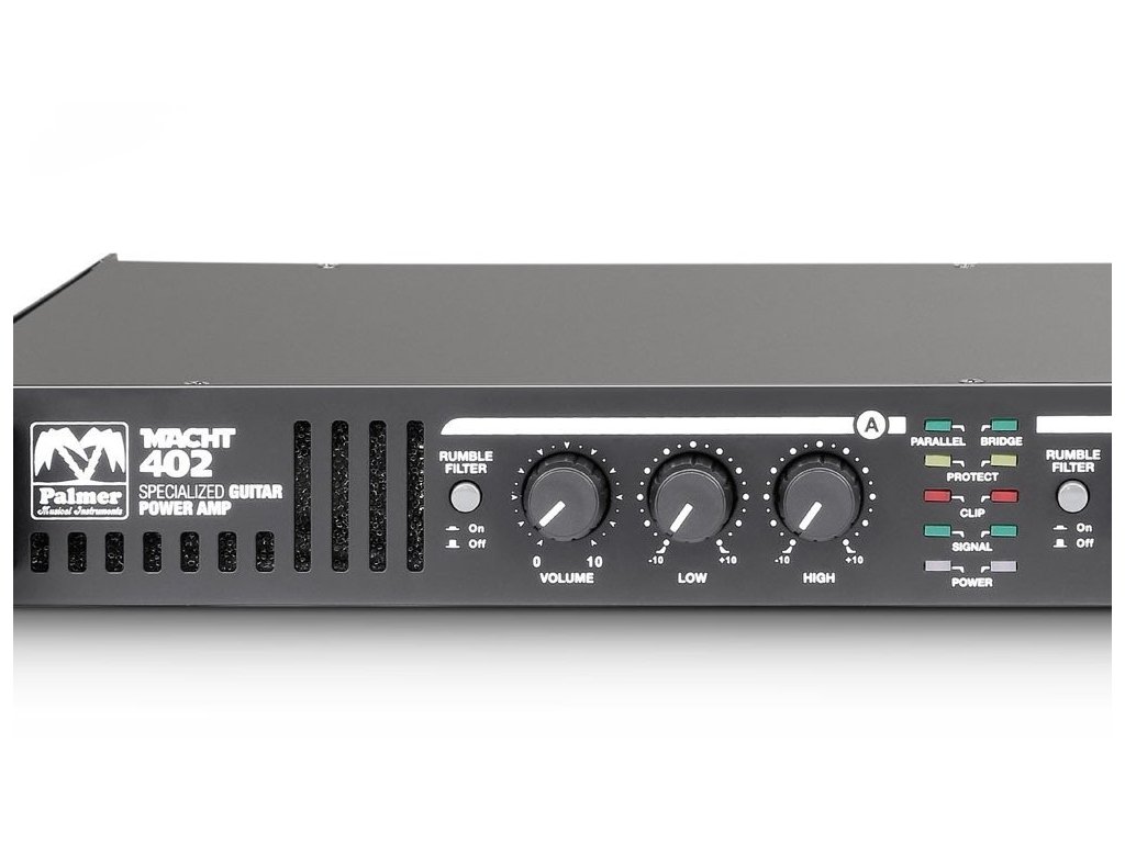 Konwencjonalnie nazwane, ale starannie dopasowane do sygnałów gitarowych, przyciski Hi i Low z rozbudowanymi możliwościami dźwiękowymi pozwalają na uzyskanie wielu brzmień i prawdziwe odczucia podczas grania na wzmacniaczu lampowym. MACHT 402 oferuje również filtry szumów, wyświetlacze LED, 3-pozycyjny przełącznik czułości wejściowej, limitery i Ground-Lift. Dzięki wejściom XLR i 1/4" oraz złączom wyjściowym kompatybilnym ze Speakon i 1/4" Palmer MACHT 402 jest idealnym, wysokowydajnym centrum dla gitarowych przedwzmacniaczy, małych wzmacniaczy, a nawet pedałów efektów.