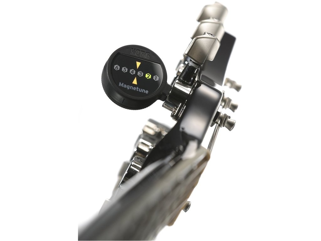 Wystarczy włączyć Magnetune, za pomocą magnesu łatwo przymocować np. do metalowych kołków stroikowych gitary i można zacząć stroić. To już zależy od Ciebie, czy zostawisz go na gitarze do dalszego dostrajania podczas występu, czy przełożysz na statyw na nuty, czy po prostu szybko schowasz do kieszeni. Magnetune to po prostu najbardziej poręczny stroik, jaki możesz sobie wyobrazić.