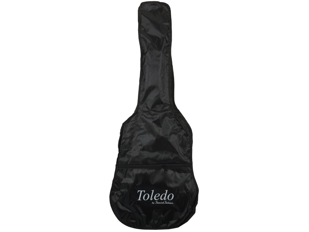 Tradycyjne elementy obejmują elegancką czarną lamówkę i ozdobną rozetę, które nadają gitarze klasyczny wygląd. Dla natychmiastowego użycia i ochrony podczas transportu, gitara jest dostarczana z praktycznym pokrowcem.