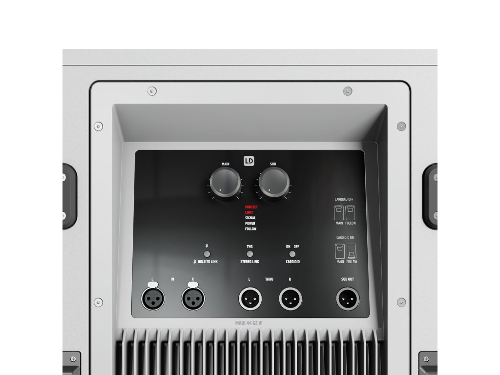 Dodając subwoofer MAUI 44 G2 SUB W, rozszerzysz kardioidalną charakterystykę kierunkową naszej profesjonalnej serii głośników kolumnowych również na obszar niskich częstotliwości.