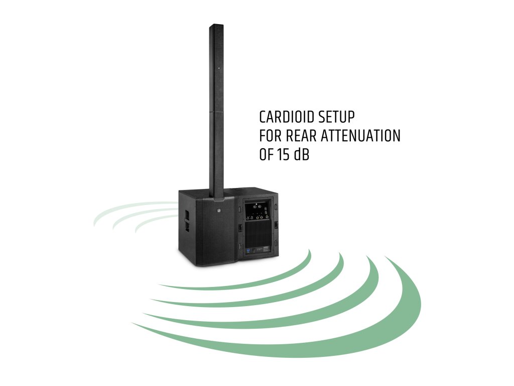 Jak to działa? Umieść subwoofer SUB obok głośnika MAUI® 44 G2 (W) tyłem do kierunku odsłuchu i aktywuj tryb kardioidalny. W ten sposób uzyskasz tłumienie niskich częstotliwości z tyłu (-15 dB) dla czystszego dźwięku z przodu, podczas gdy przedni głośnik zachowa swoją pełną moc uderzenia. Jeśli natomiast chcesz uzyskać maksymalną wydajność basów bez ograniczeń, pozostaw SUB w tym samym kierunku co MAUI® 44 G2 (W) i nie aktywuj przycisku kardioidalnego.