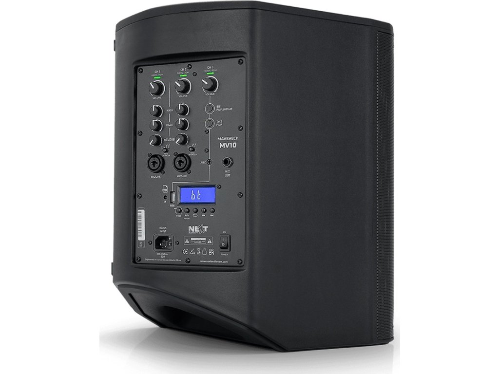 Kolumna głośnikowa Maverick MV10 to aktywna kolumna głośnikowa z 10" głośnikiem basowym i 1" driverem wysokotonowym. Jest wyposażona w Bluetooth i akumulator umożliwiający do 8 godzin użytkowania bez dostępu do sieci zasilającej. Dzięki kompaktowym rozmiarom, bogatej łączności i doskonałemu dźwiękowi można go używać do standardowego nagłośnienia, jako monitora instrumentalnego, kolumny głośnikowej do buskingu, do mobilnego nagłośnienia mniejszych imprez. Można go również używać jako część profesjonalnego nagłośnienia, jako odsłuch, lub kolumna wypełniająca lub opóźniająca. Umożliwia wierne odtwarzanie muzyki na żywo i reprodukowanej oraz słowa mówionego. Model MV10 może być również używany jako powerbank. Bezprzewodowy profesjonalny system stereo można łatwo stworzyć, parując dwa MV10 przez BT za pomocą funkcji TWS (True Wireless Stereo).