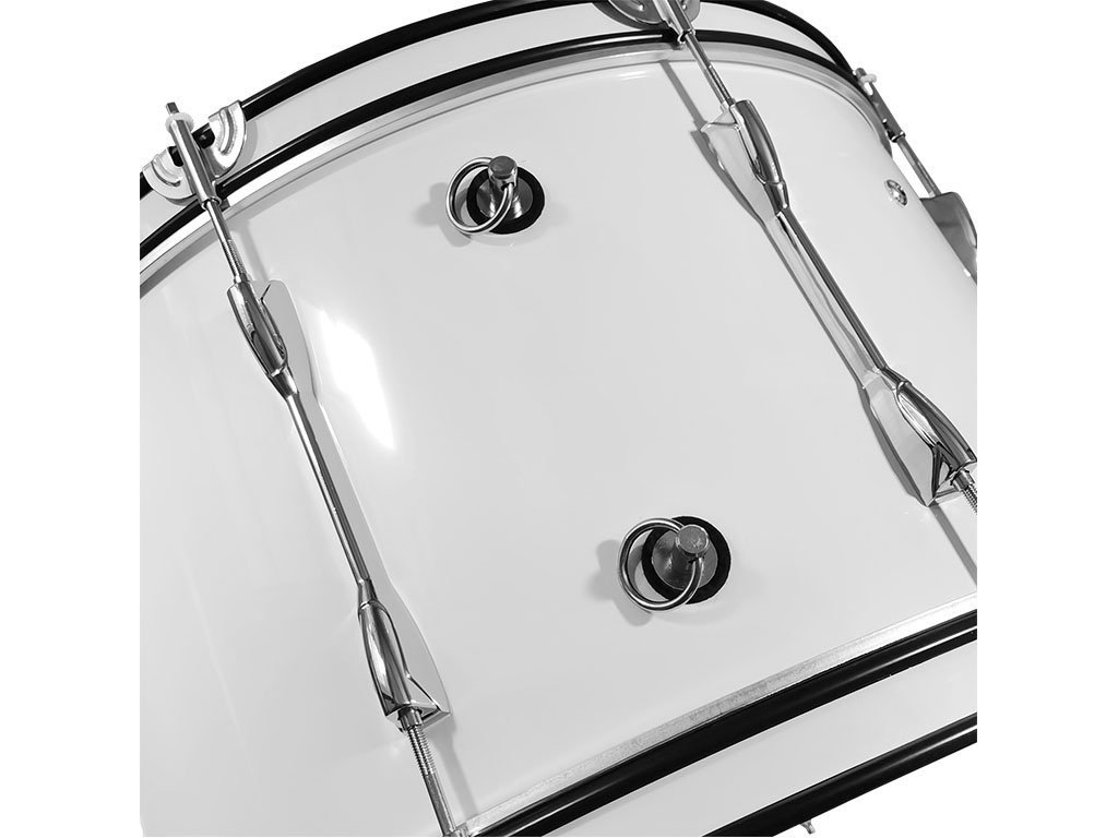 Bęben basowy V-tone MBD 22 został wykonany z dbałością o szczegóły. Wygodna konstrukcja ramy nośnej umożliwia regulację wysokości bębna w kilku pozycjach. Pasy naramienne i podpórka brzuszna są pokryte miękkim materiałem, dzięki czemu nie powodują nadmiernego ucisku i zapewniają komfort podczas gry. Duża średnica i szerokość bębna gwarantują głęboki i głośny dźwięk instrumentu. Na uwagę zasługuje również estetyczne białe wykończenie z czarnymi elementami i chromowanym hardwarem.