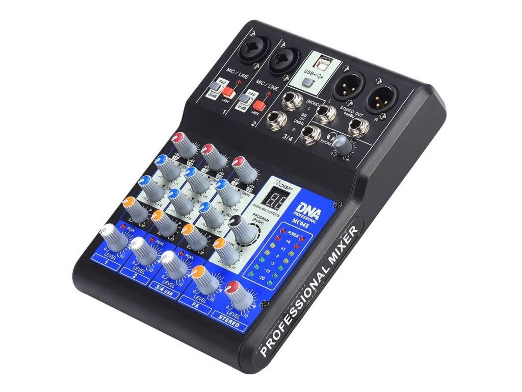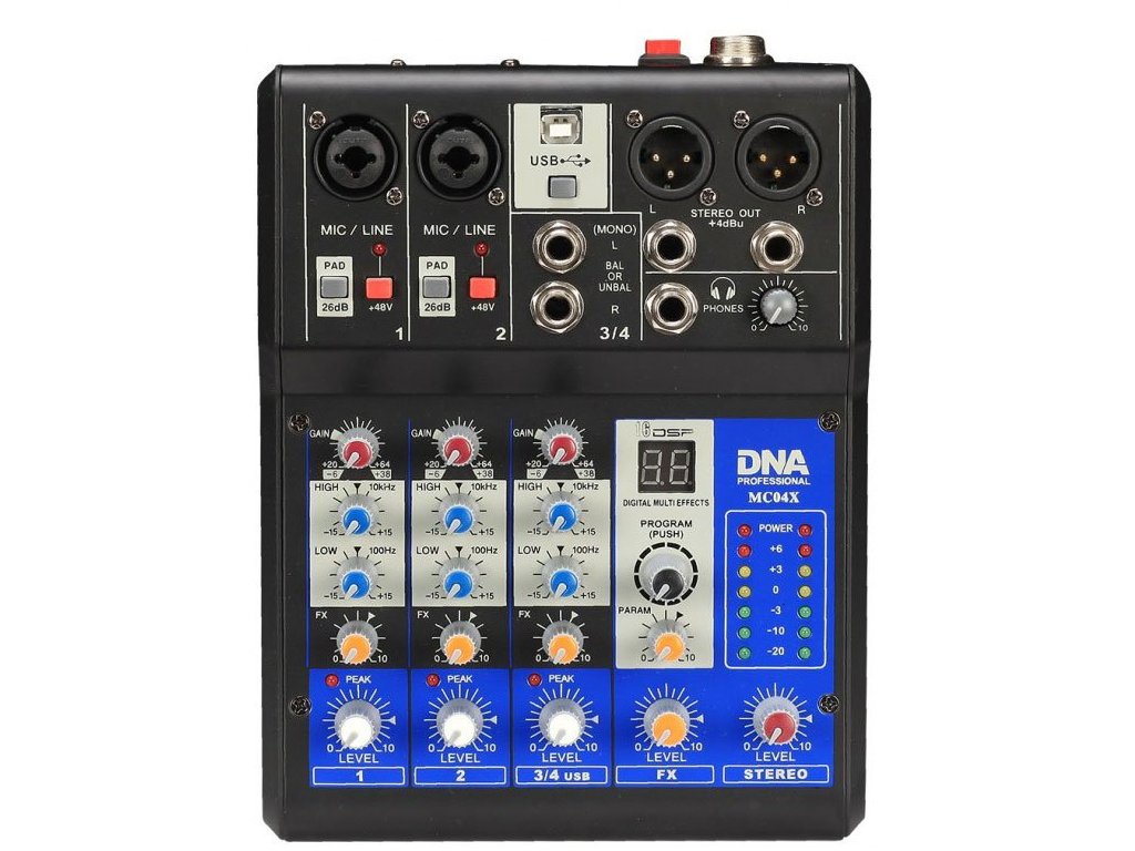 DNA MC04X to czterokanałowy analogowy mikser. Wyposażony jest w 4 wejścia liniowe (2 mono i 1 stereo), 2 symetryczne wyjścia XLR z wysokiej jakości przedwzmacniaczami, port USB, zasilanie Phantom + 48V (oddzielne dla każdego kanału!) oraz rozbudowany procesor efektów (DSP).