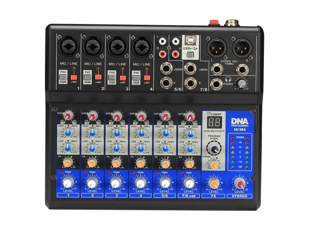 DNA MC08X to 8-kanałowy analogowy mikser audio firmy DNA. Mikser jest wyposażony w 8 wejść liniowych (4 mono i 2 stereo), 2 symetryczne wyjścia XLR z wysokiej jakości przedwzmacniaczami, port USB, zasilanie Phantom + 48V (oddzielne dla każdego kanału!) oraz procesor z rozbudowanymi efektami (DSP). Dodatkowo, kanały 7 i 8 zostały rozszerzone o złącza cinch, dzięki którym możemy podłączyć dodatkowe urządzenia peryferyjne do konsoli.