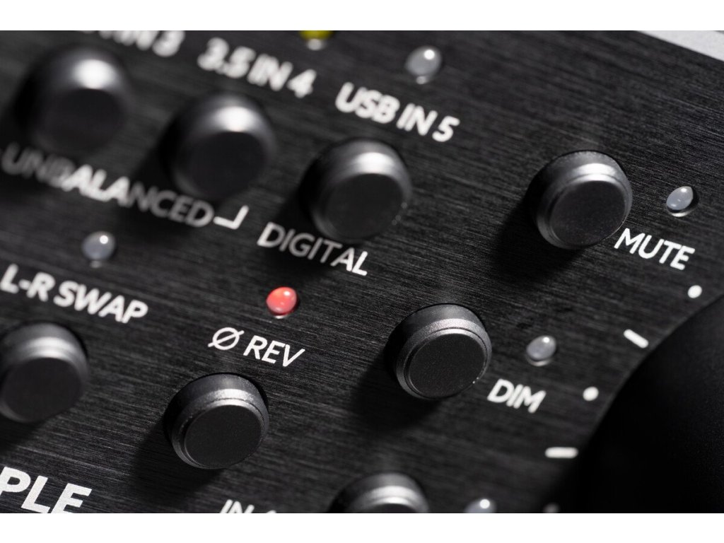 Do wyboru wejścia służą przyciski w lewej górnej części panelu przedniego. Wejścia wybiera się pojedynczo lub można wybrać kilka wejść jednocześnie; ich sygnał jest wtedy słyszalny jednocześnie. Aktywne wejścia są oznaczane świecącą diodą LED. Lampka kontrolna LED wejścia USB wyświetla sygnały PCM na zielono, a sygnały DSD na niebiesko. W przypadku niesymetrycznych wejść 3 i 4 można wybrać jedną z dwóch wartości czułości - komercyjną -10 dBV i profesjonalną +4 dBu.