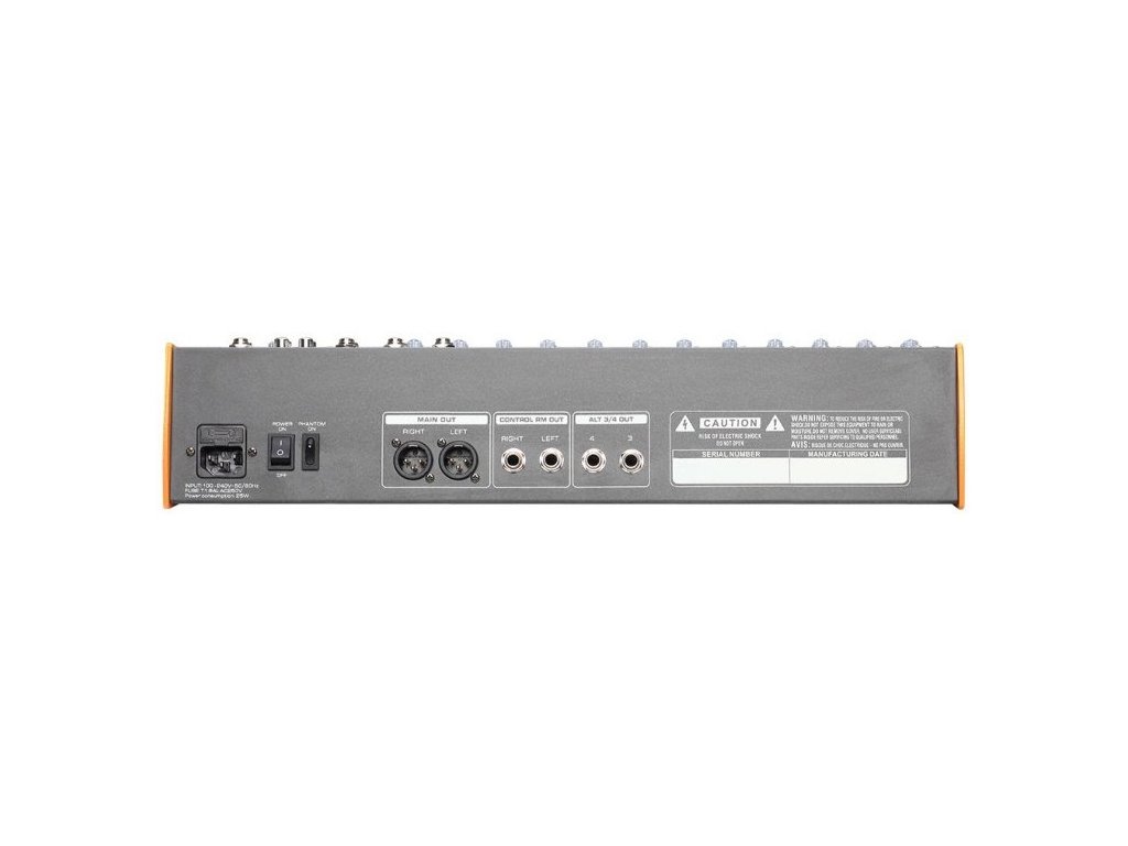 Na tylnym panelu obudowy znajdują się gniazda wyjściowe ALT 3/4 do podłączenia drugiego miksera lub alternatywnego systemu PA, główne wyjścia MAIN OUT do podłączenia głównego źródła dźwięku, gniazda i przełączniki oraz przełącznik phantom + 48V. Dzięki niej konsola jest w stanie zasilać urządzenia zewnętrzne i pasywne instrumenty.