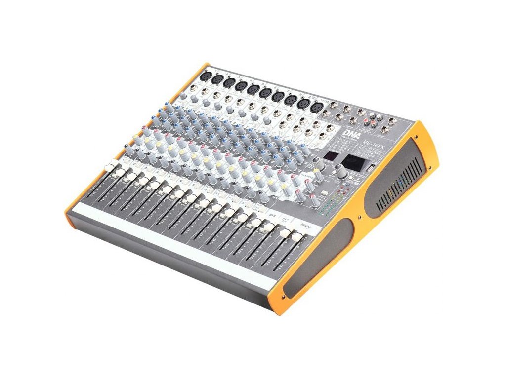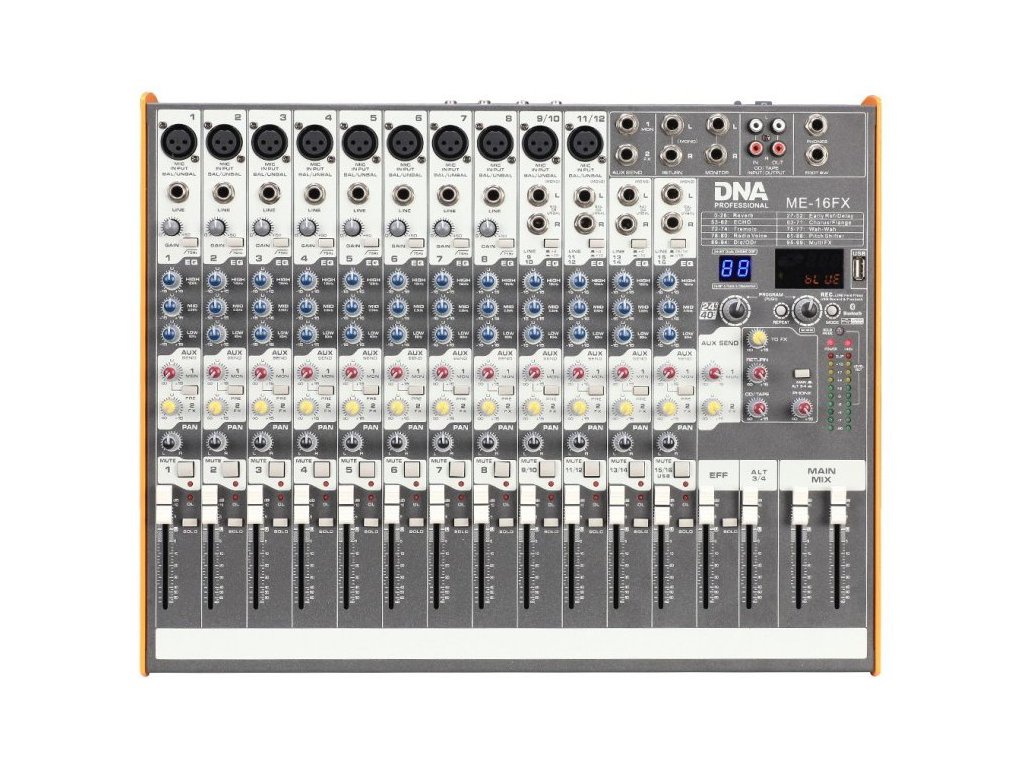 DNA ME-16FX to profesjonalny analogowy 16-kanałowy mikser audio z serii ME od DNA. Urządzenie jest wyposażone w 8 wejść mono (MIC / LINE) i 4 wejścia stereo do podłączenia do miksera, np. Klawisze, elektroniczna perkusja i inny sprzęt muzyczny. Ponadto konsola posiada gniazda AUX (Send, Return), wyjścia jack na monitory i słuchawki, a także gniazdo przełącznika nożnego, dzięki któremu możemy włączać lub wyłączać efekty miksera za pomocą zewnętrznego przełącznika. Ta część zawiera również gniazda cinch, które dodatkowo rozszerzają możliwości konsoli.